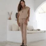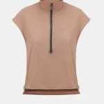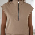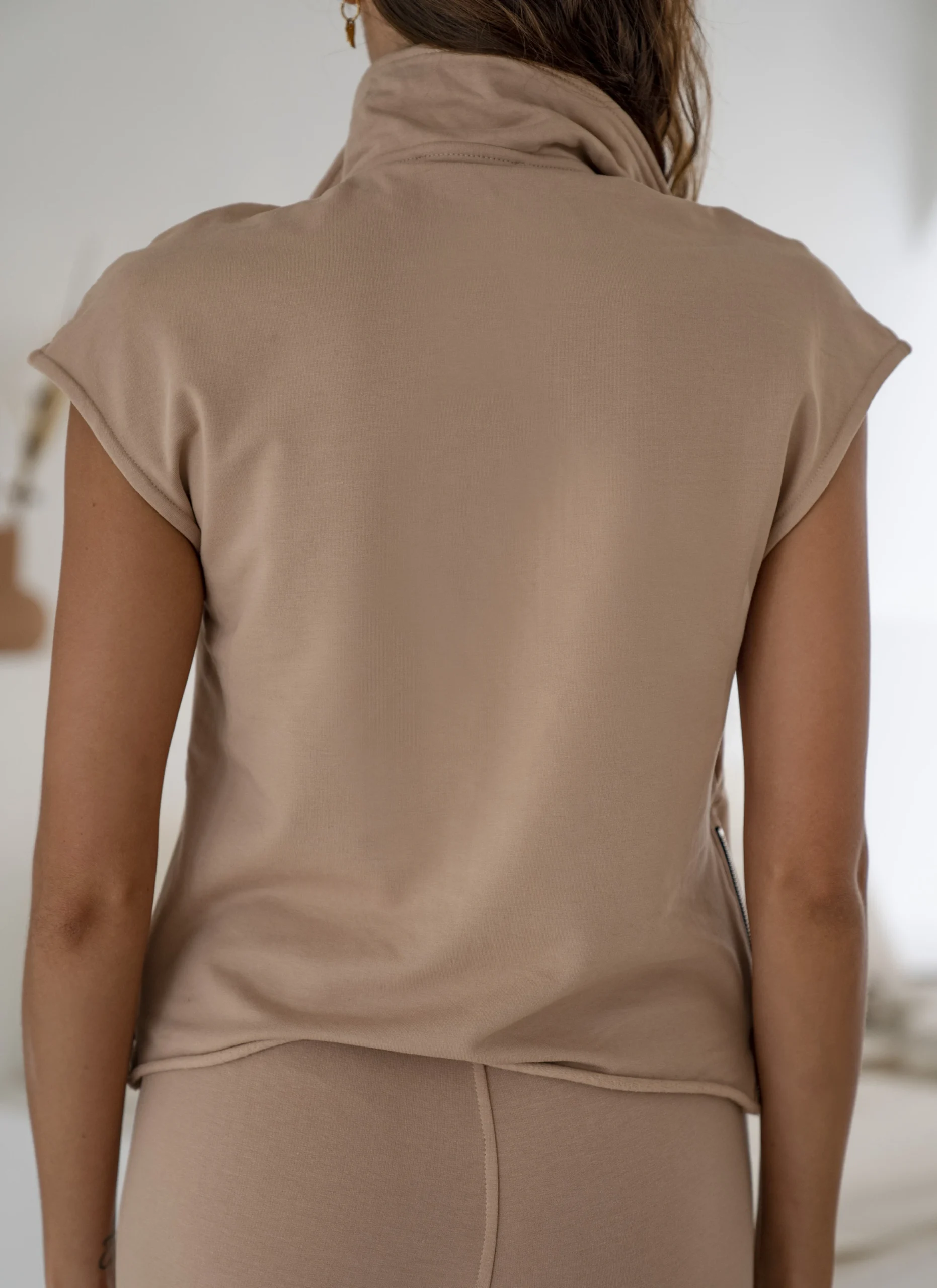 A sleeveless jacket with a slightly fitted cut in beige.
