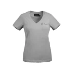 This is a women's blouse with short sleeves. The v-shaped neckline will optically lengthen the neck. The T-shirt has a fitted and waisted cut that will accentuate your figure.