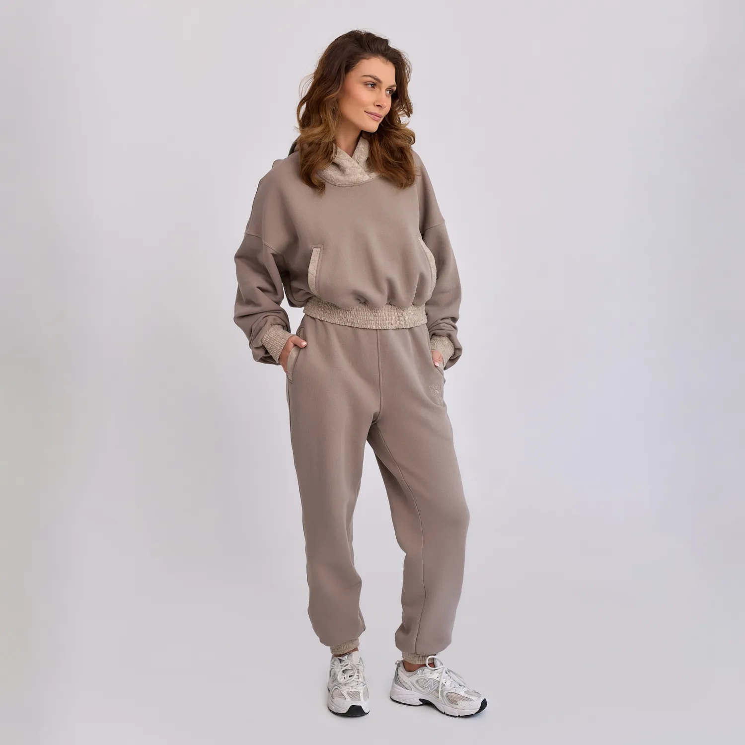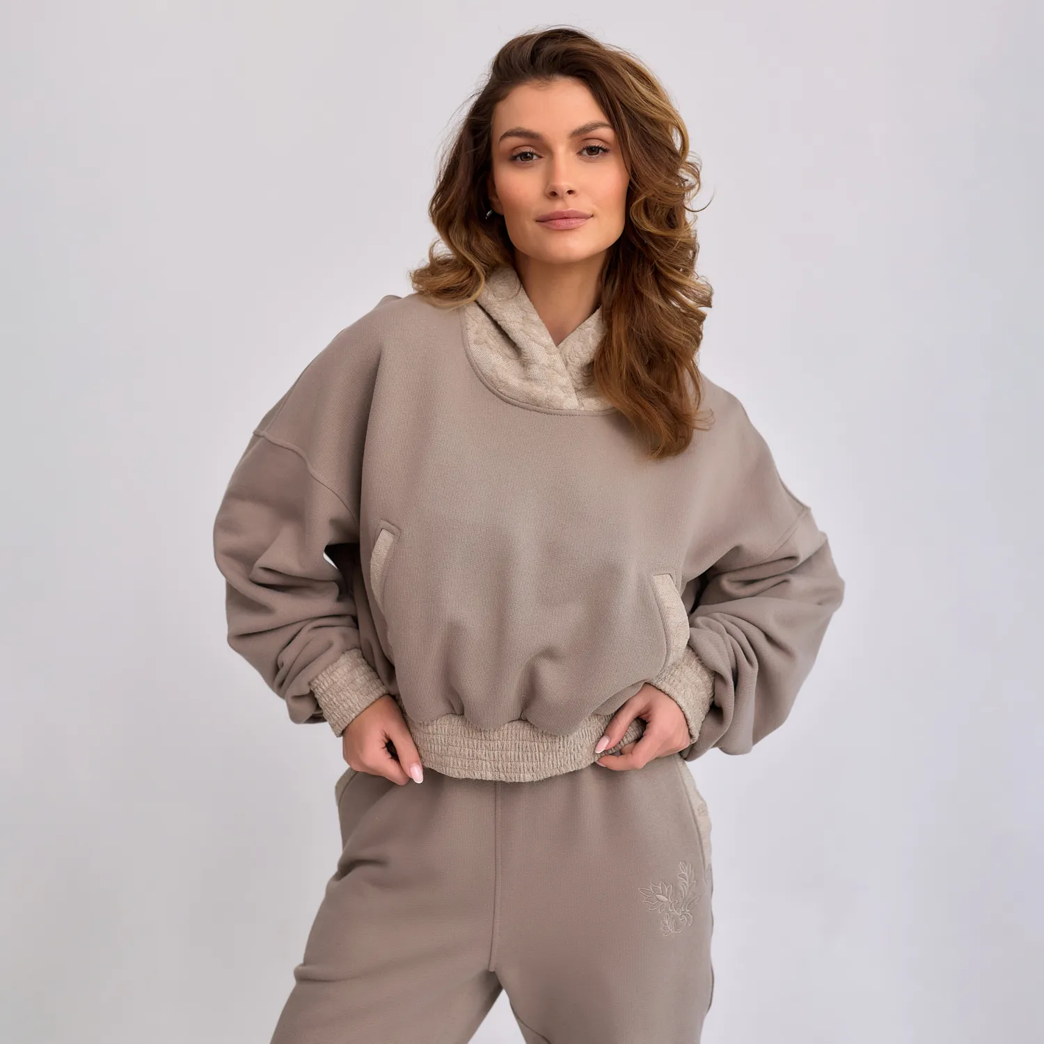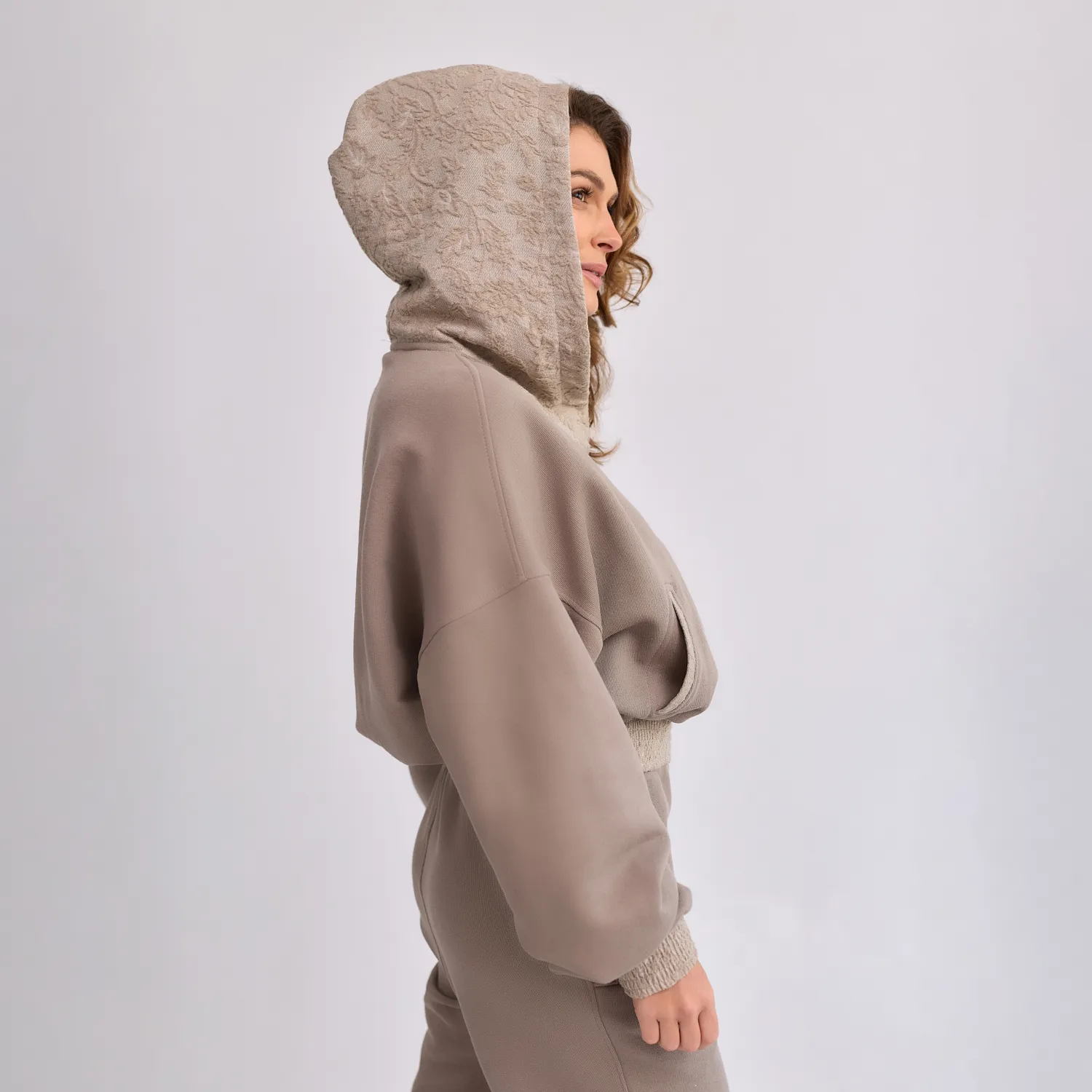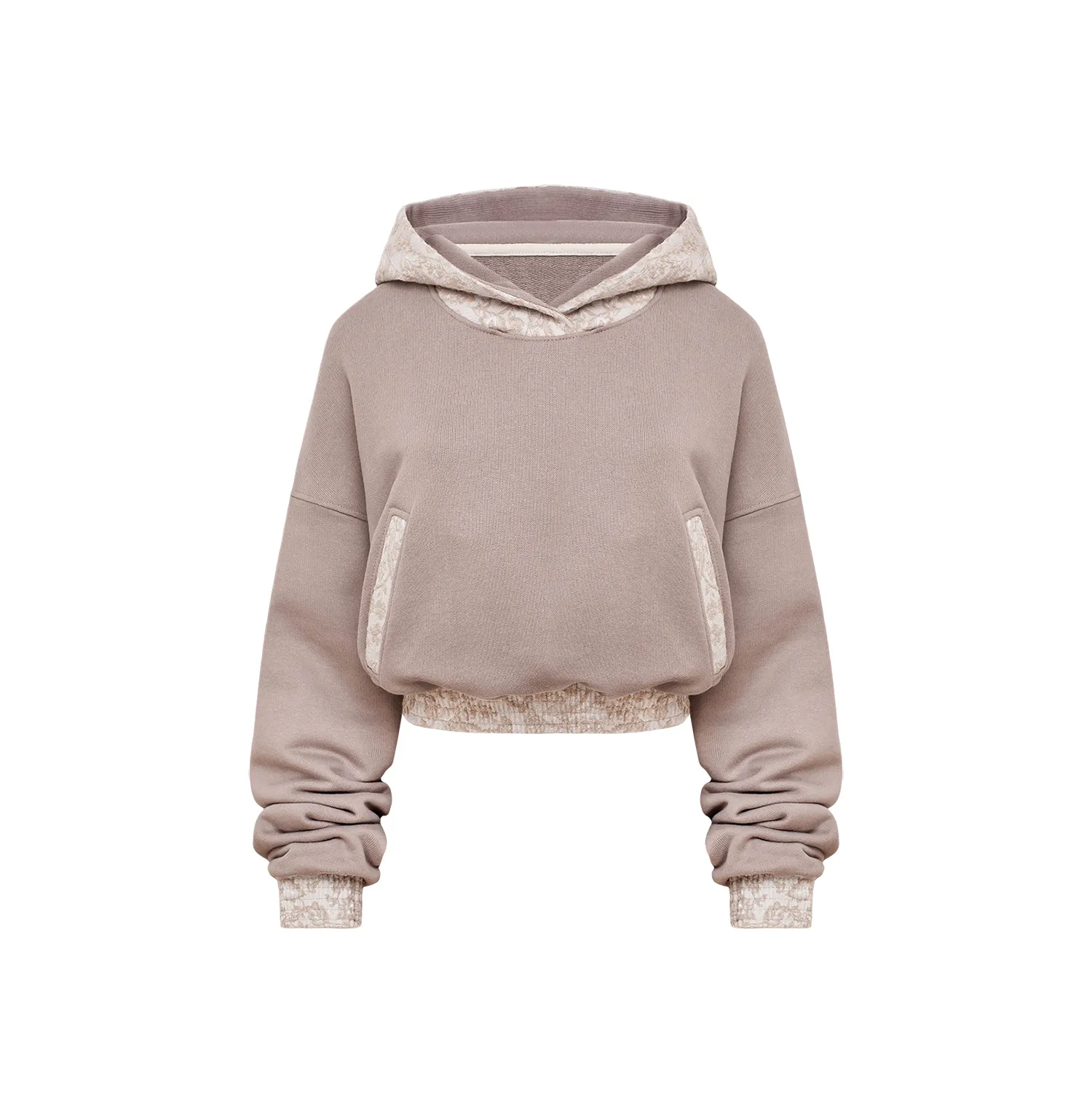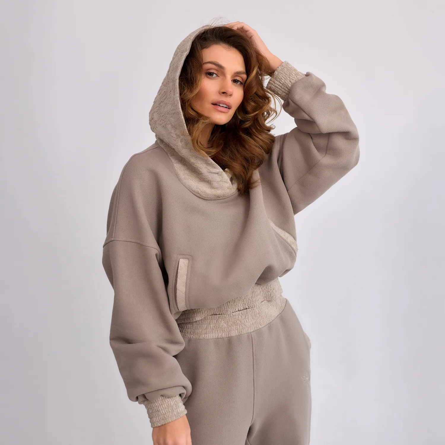 To, co wyróżnia bluzę, to subtelna gra faktur. Klasyczny dresowy materiał został zestawiony z eleganckim żakardem o delikatnym, kwiatowym wzorze. Akcent ten pojawia się na kapturze, obszyciach kieszeni oraz ściągaczach, nadając całości wyrafinowania.