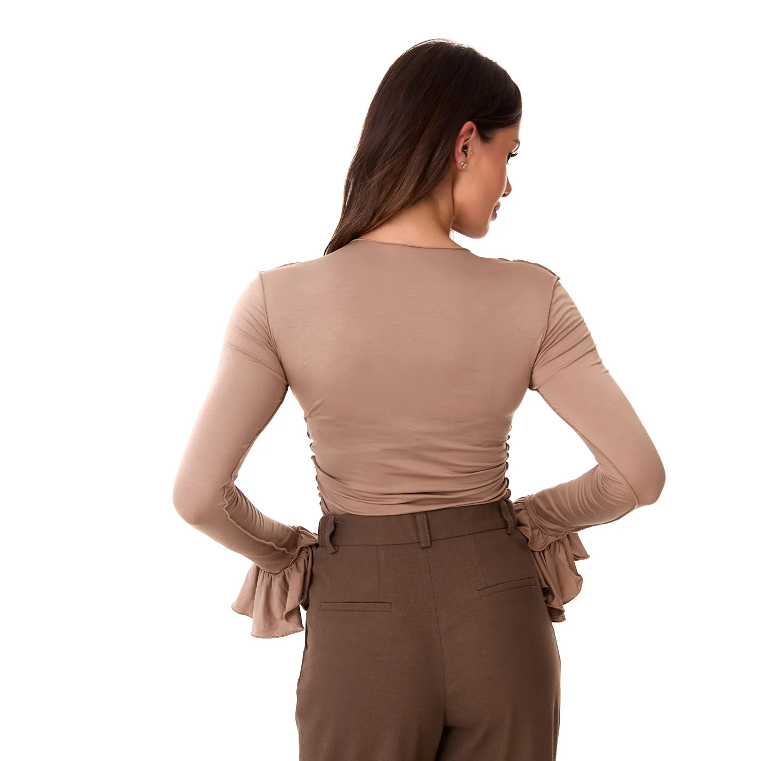 Elegancka bluzka na długi rękaw zakończona efektownymi falbanami, które komplementują się wzajemnie z ozdobną różą na piersi. Elastyczna, dopasowana do ciała tkanina podkreśla i uwydatnia kobiece kształty, a marszczony materiał w okolicy talii dodaje swobody i komfortu, optycznie wyszczuplając sylwetkę. Przyjemna w dotyku, subtelnie zakończona zapewnia miękkość i delikatność.