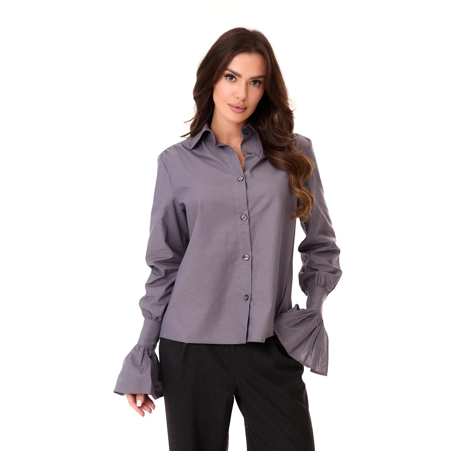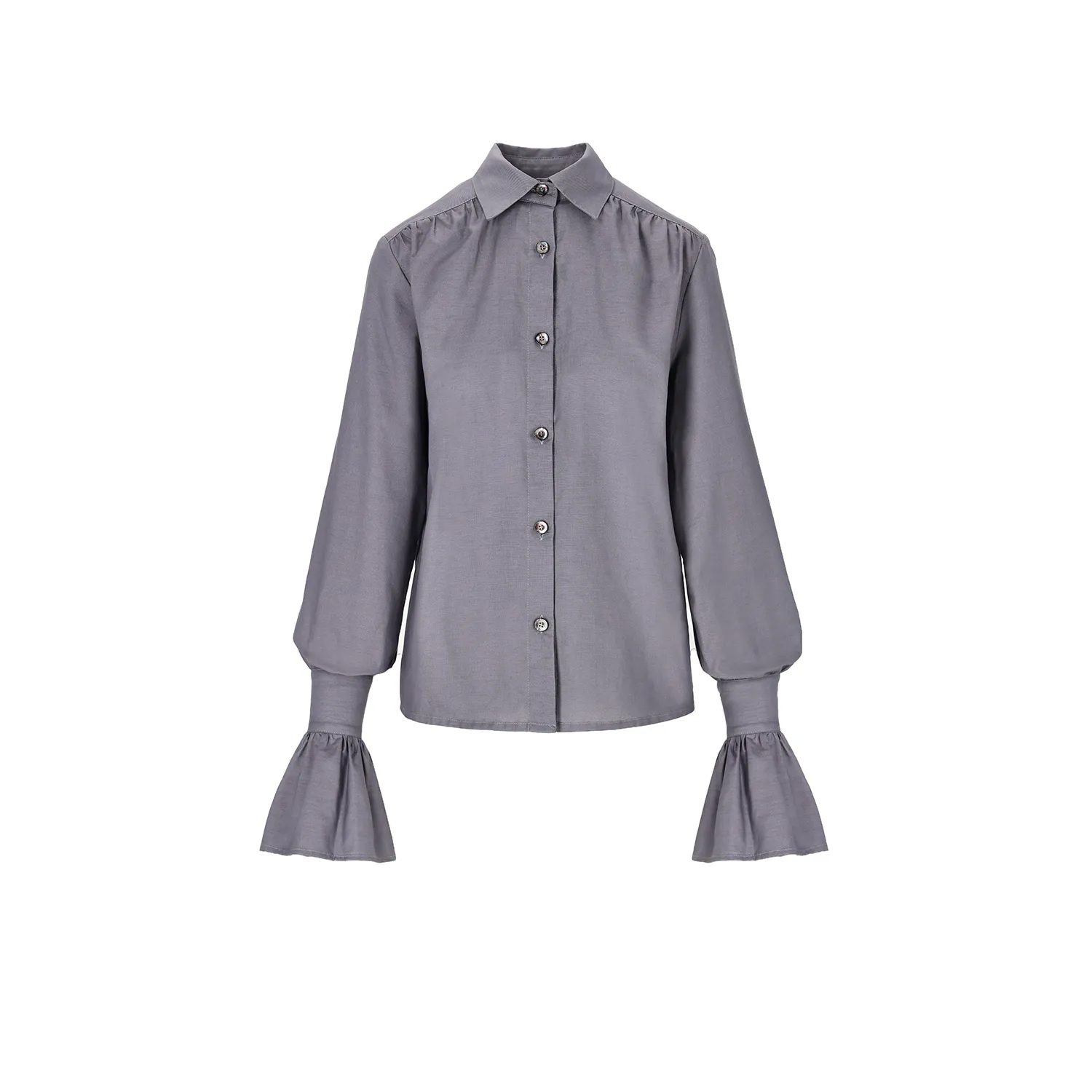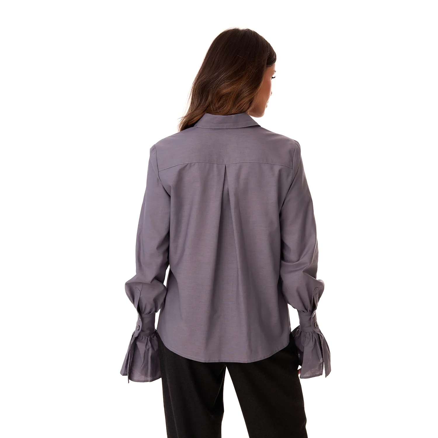 Zapinana na guziki w komplementującym kolorze, wykończona klasycznym kołnierzem oraz ozdobnymi marszczeniami na ramionach. Tył koszuli o zaokrąglonym dole wraz z karczkiem z zakładkami.