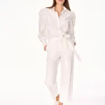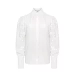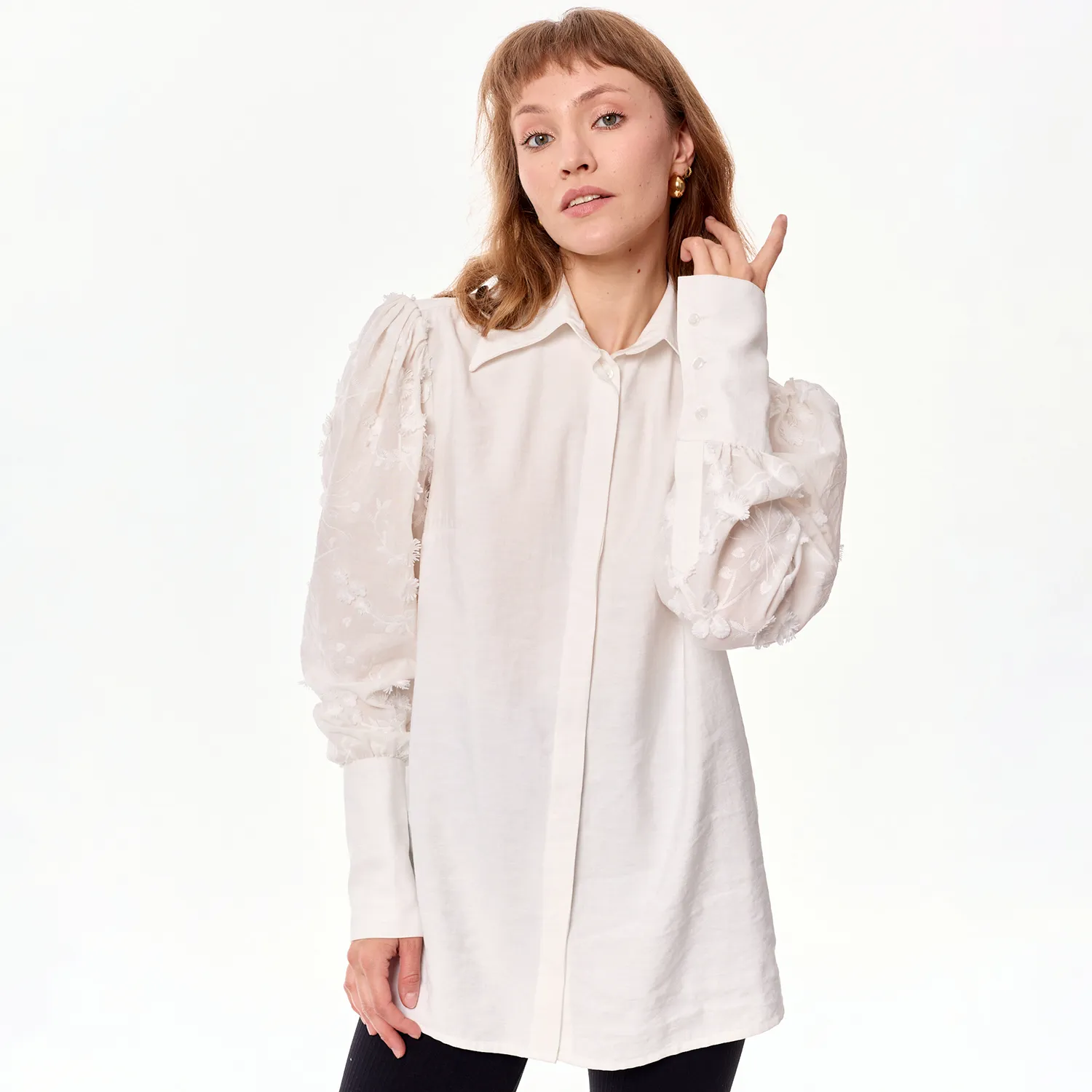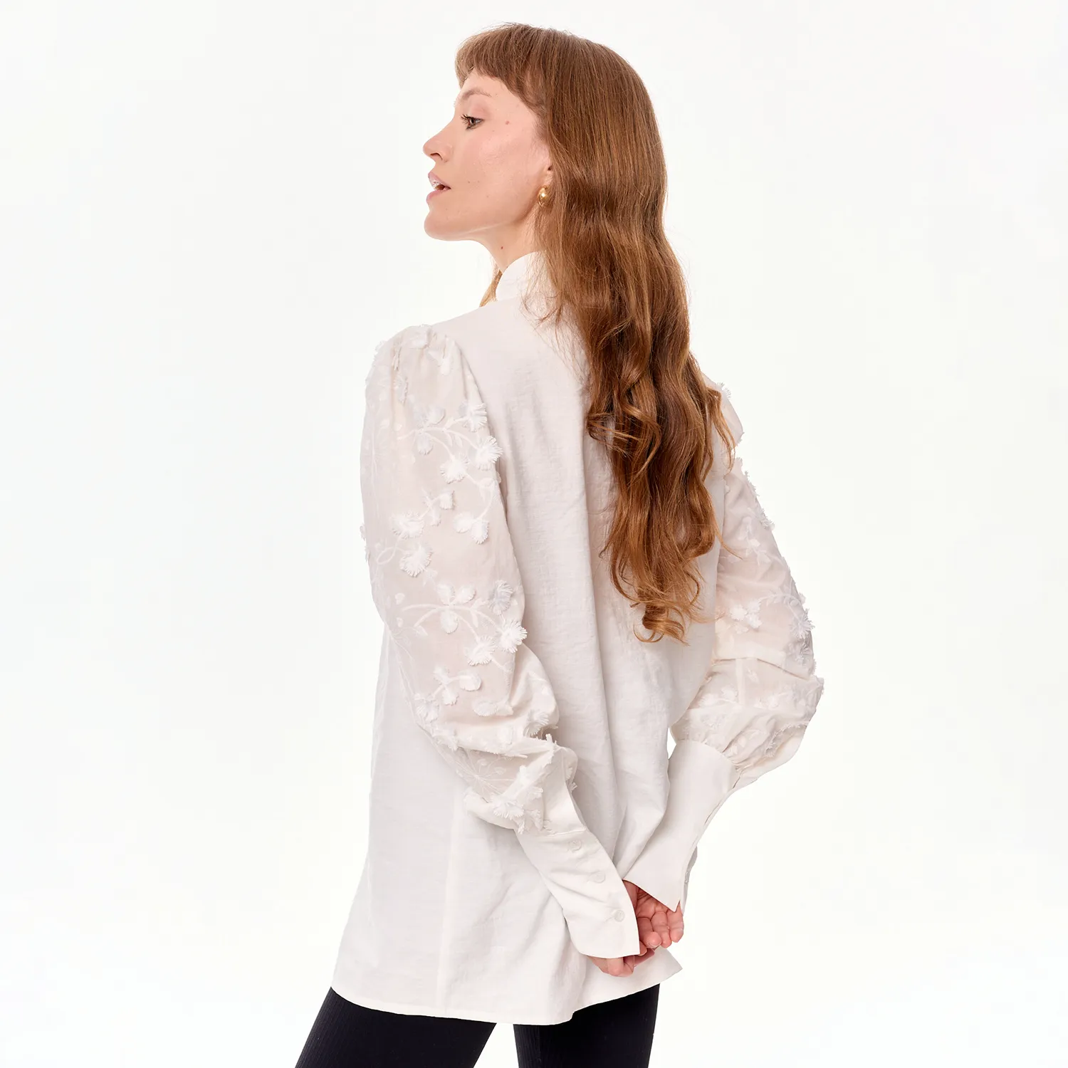 Bufiaste ramiona i lekko prześwitujące rękawki podkreślają kobiecość, nadając stylizacji lekkości i zwiewności. Długie mankiety i elegancki kołnierzyk dopełniają całość, tworząc klasyczny, ale niebanalny design, który sprawdzi się zarówno w codziennych, jak i bardziej formalnych stylizacjach.