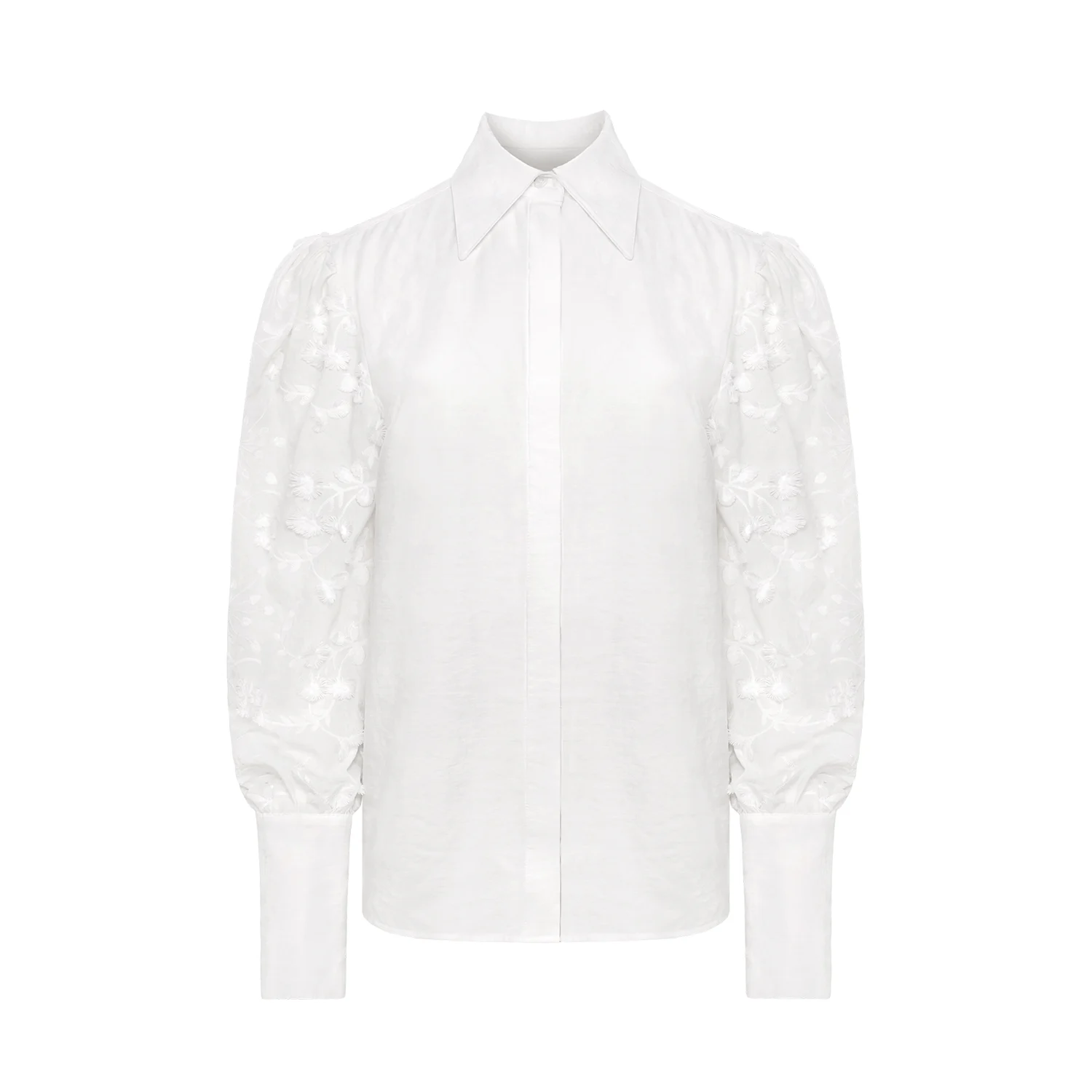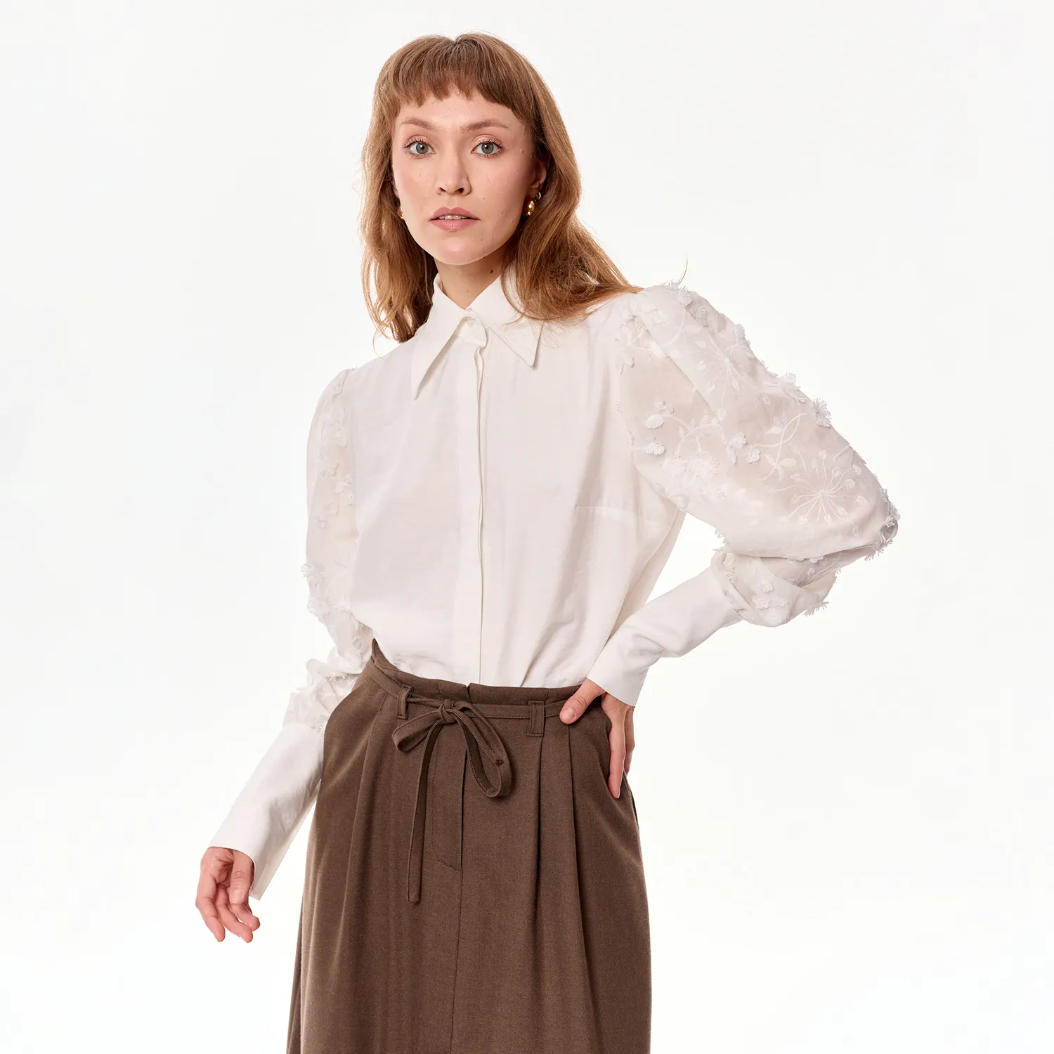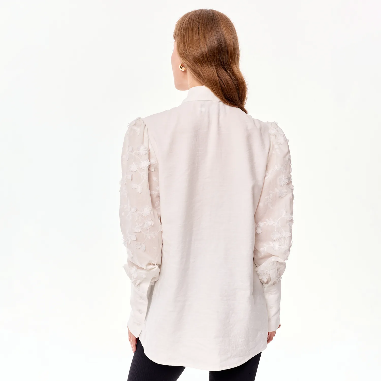 Koszula Madden to połączenie elegancji z delikatnym, kobiecym akcentem. Wykonana z łączonych materiałów o wysokiej jakości. Główny materiał – wiskoza z dodatkiem poliestru, zapewnia miękkość i komfort noszenia. Rękawy wykonane ze 100% bawełny z pięknym, charakterystycznym haftem kwiatowych zdobień, przyciągają uwagę i dodają całości romantycznego klimatu.