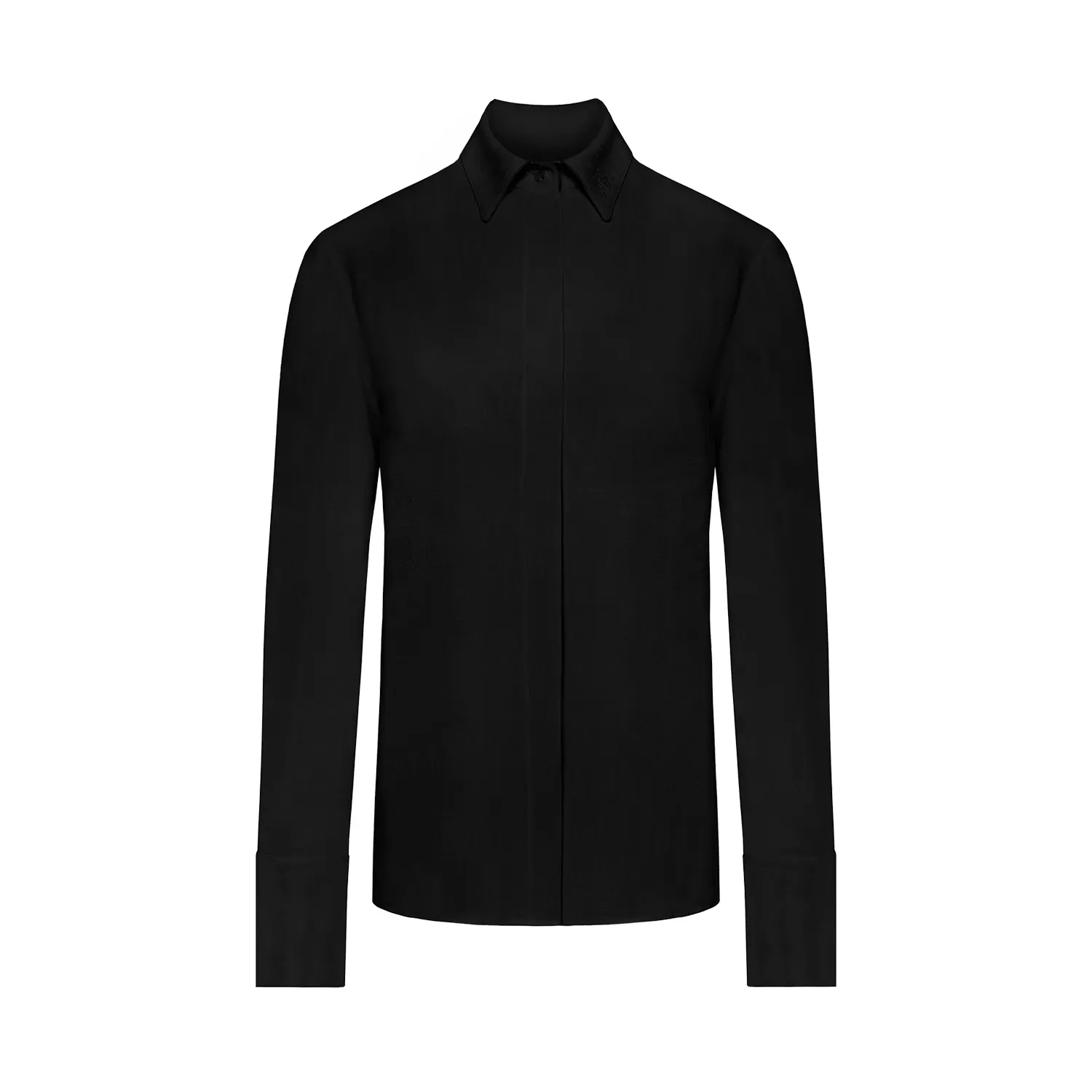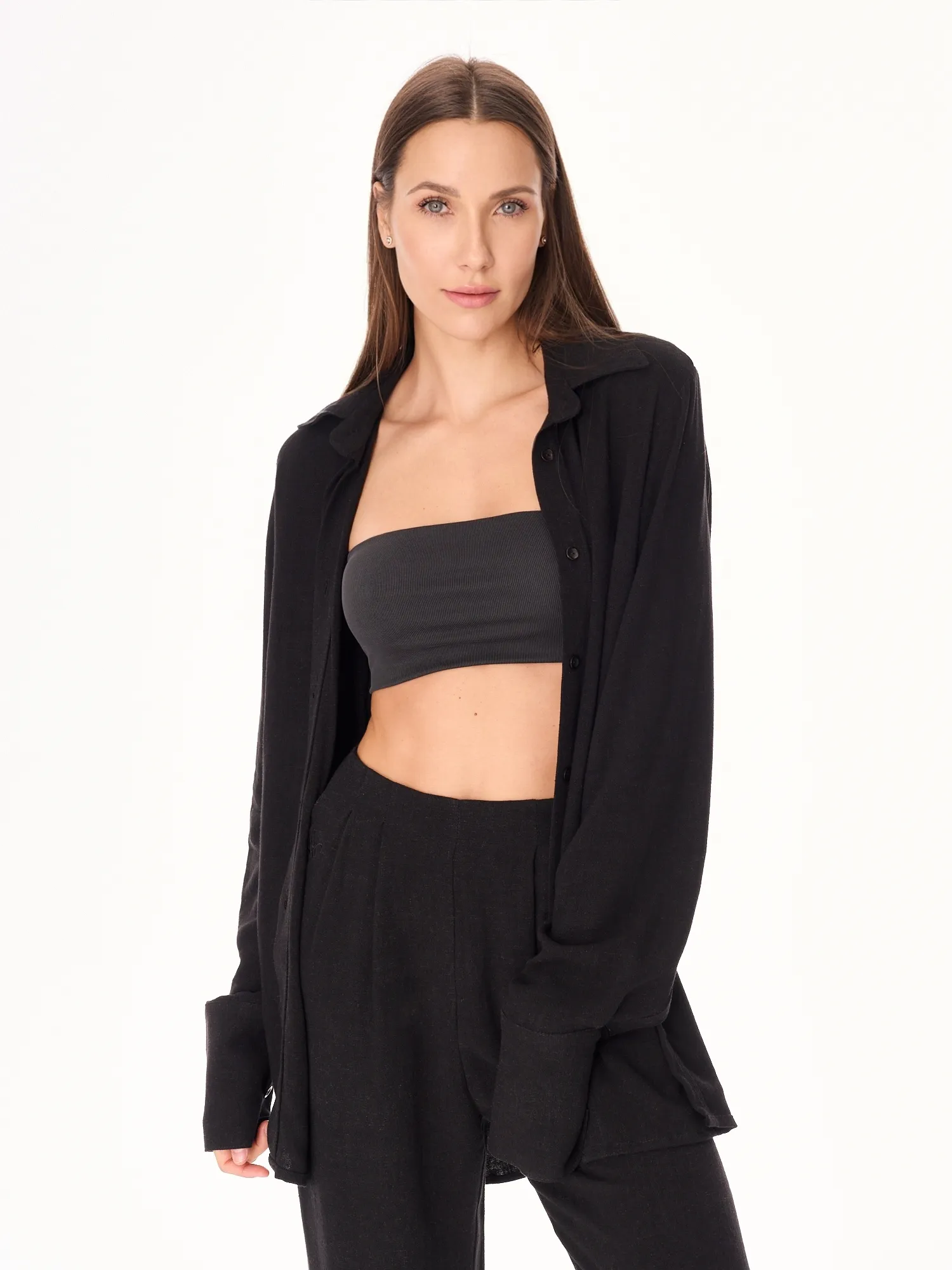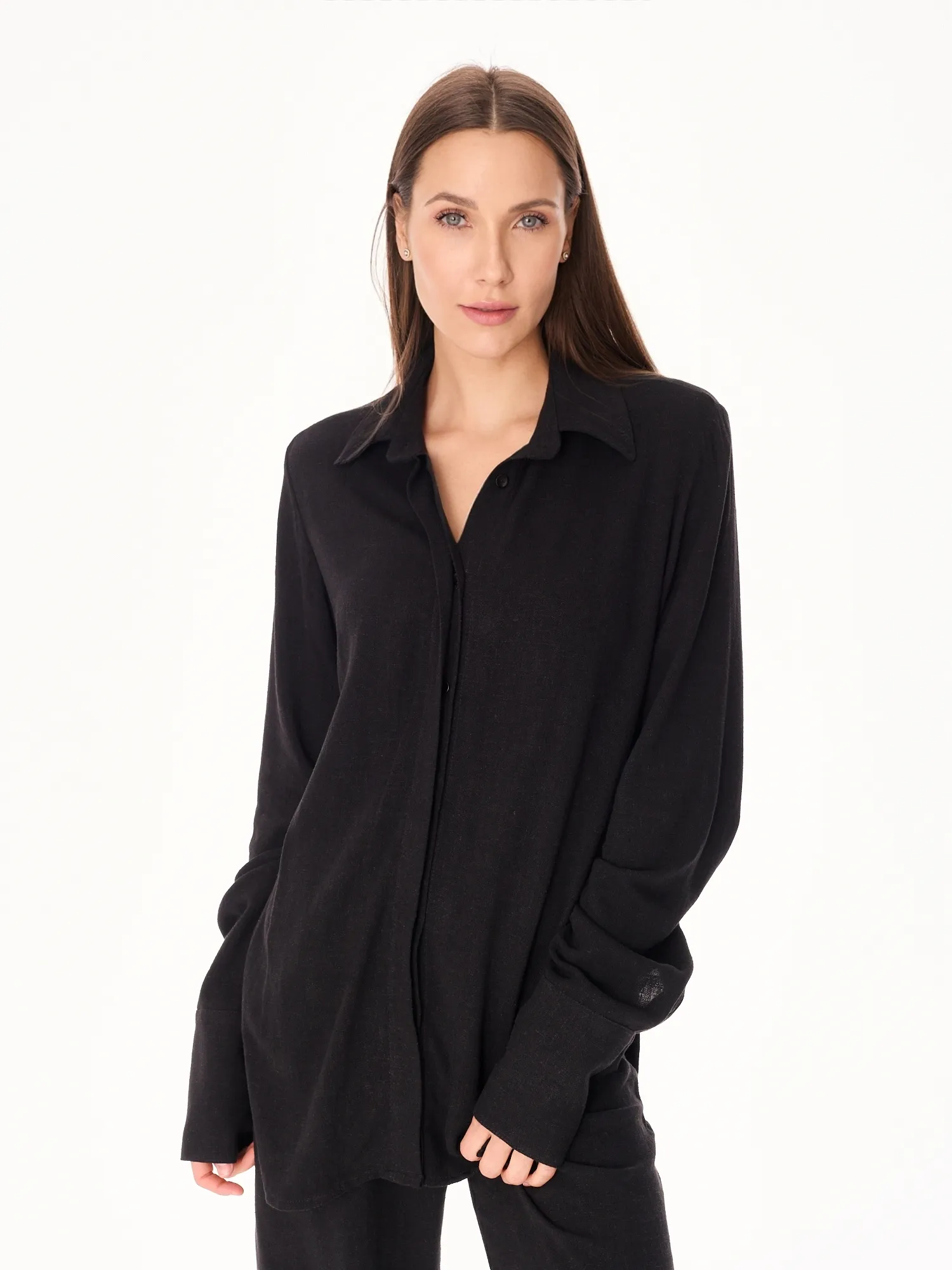 Koszula o dłuższym, lejącym fasonie. Idealny wybór dla ceniących wygodę i styl. Wykonana z materiału z domieszką lnu – przyjemny w dotyku, pięknie się układa i komfortowo nosi. Klasyczny kołnierz zdobiony subtelnym haftem „MG”. Długie rękawy zakończone szerokimi mankietami. Z przodu, jak i z tyłu, zapinana na guziki ukryte pod plisą, która nadaje delikatności.