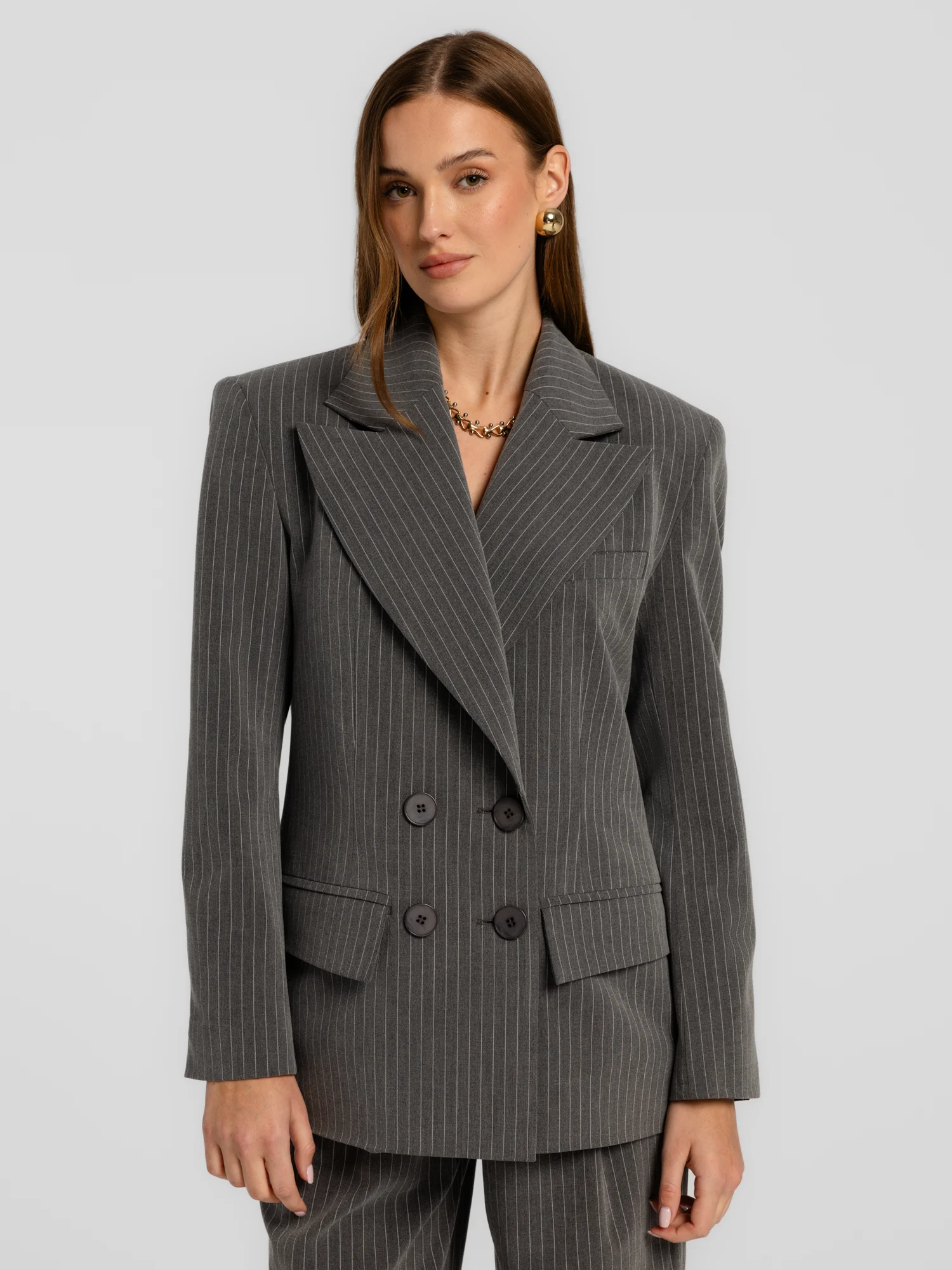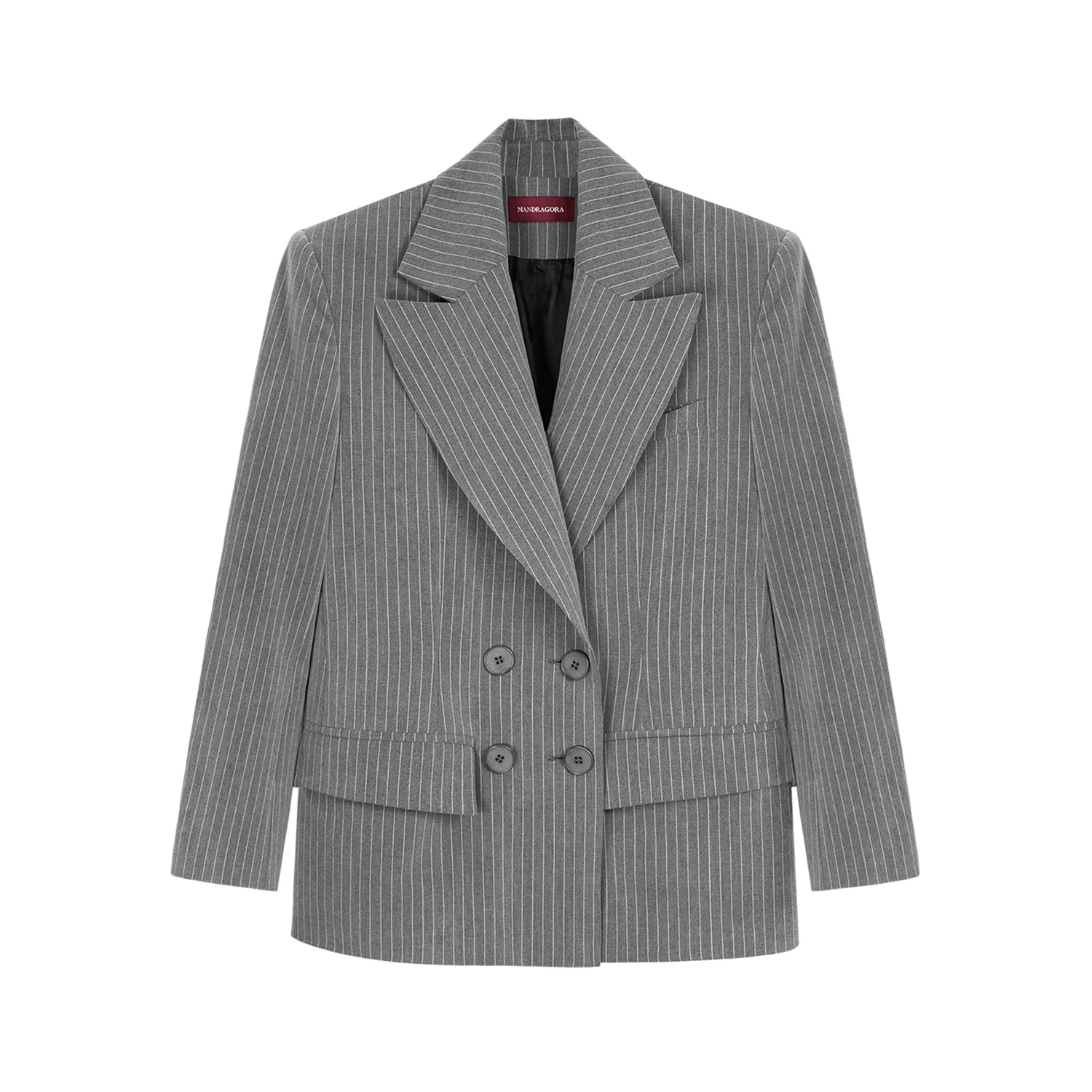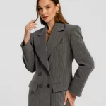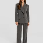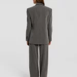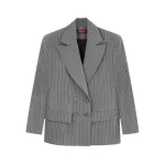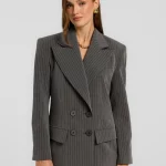 Marynarka o konstrukcji inspirowanej klasycznym krawiectwem, z wyraźnie zaznaczoną linią ramion i poszerzonymi klapami. Dwurzędowe zapięcie podkreśla elegancki, ponadczasowy charakter projektu. Subtelne, kontrastujące paski na materiale dodają całości głębi, a precyzyjne przeszycia szlachetności. Wykonana z wiskozowego materiału, doskonale sprawdzi się zarówno w stylizacjach formalnych, jak i codziennych.