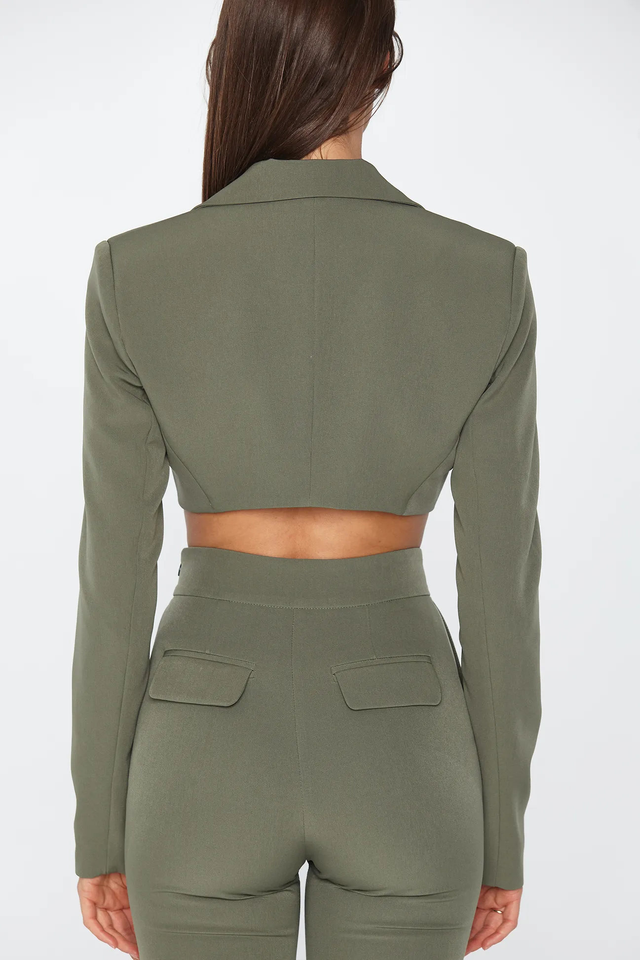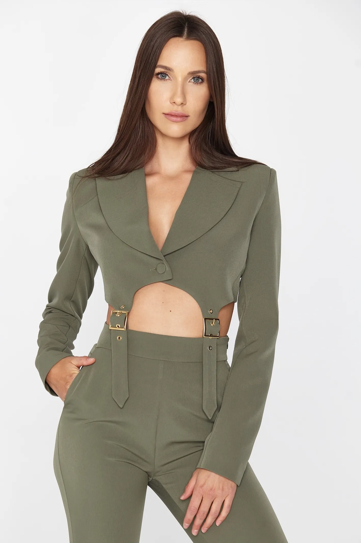 Marynarka o kroju crop w eleganckim, wyjątkowym kolorze khaki. Zapinana na ozdobny guzik. Szerokie, owalne klapy dodają uroku. Fason dopasowuje się do ciała i pięknie podkreśla jego atuty. Wykonana z poliestru, który zachowuje swój nieskazitelny wygląd – jest odporny na zagniecenia, nie wyciąga się, dzięki czemu utrzymuje prawidłową formę.