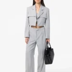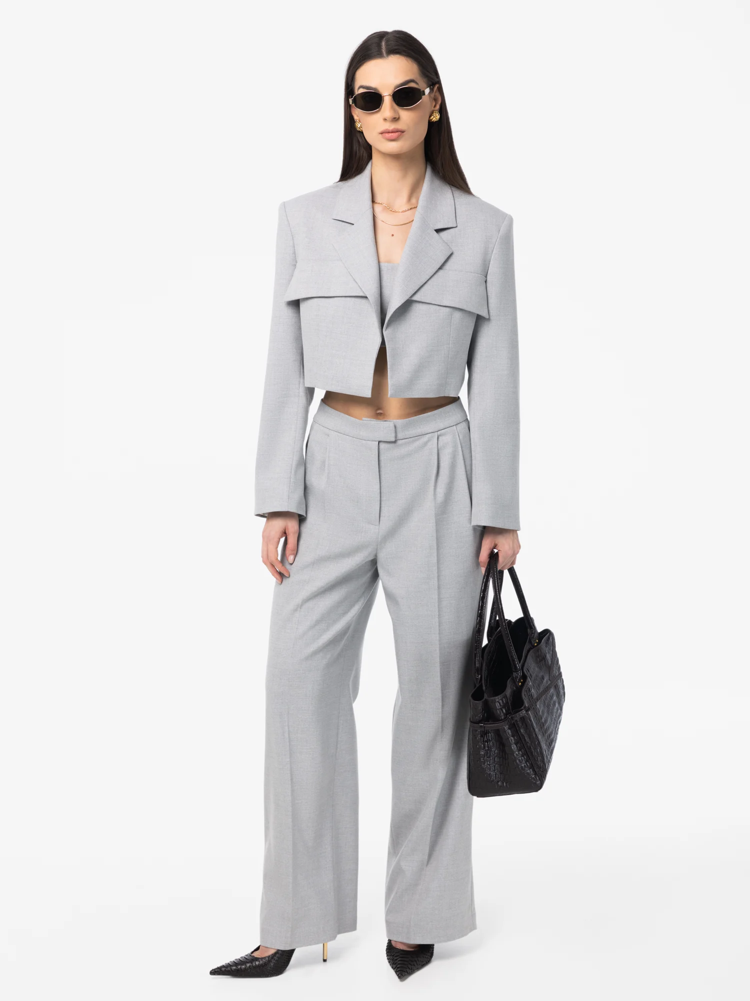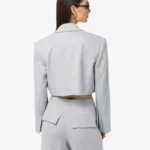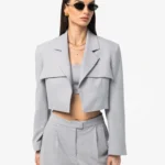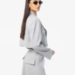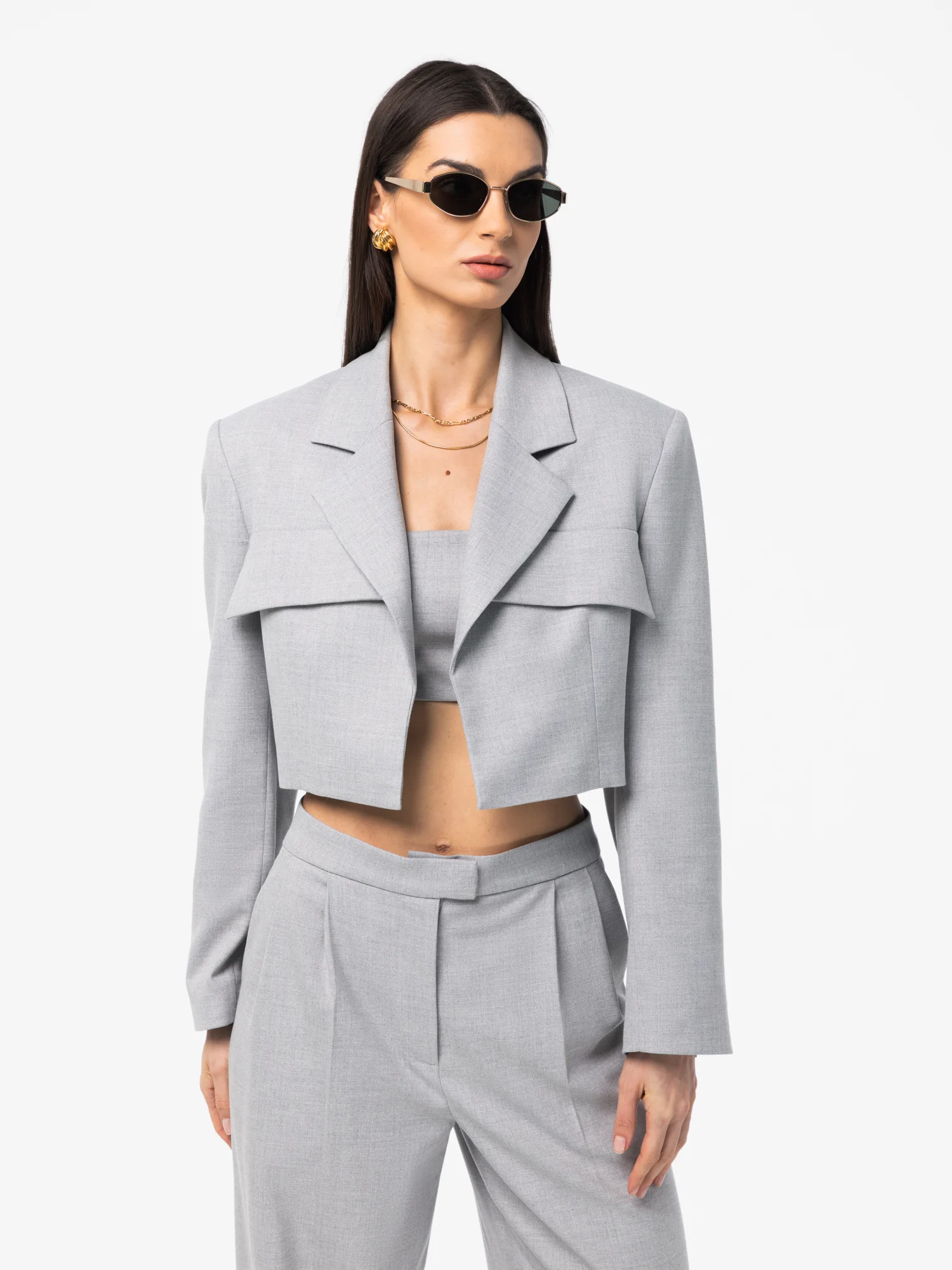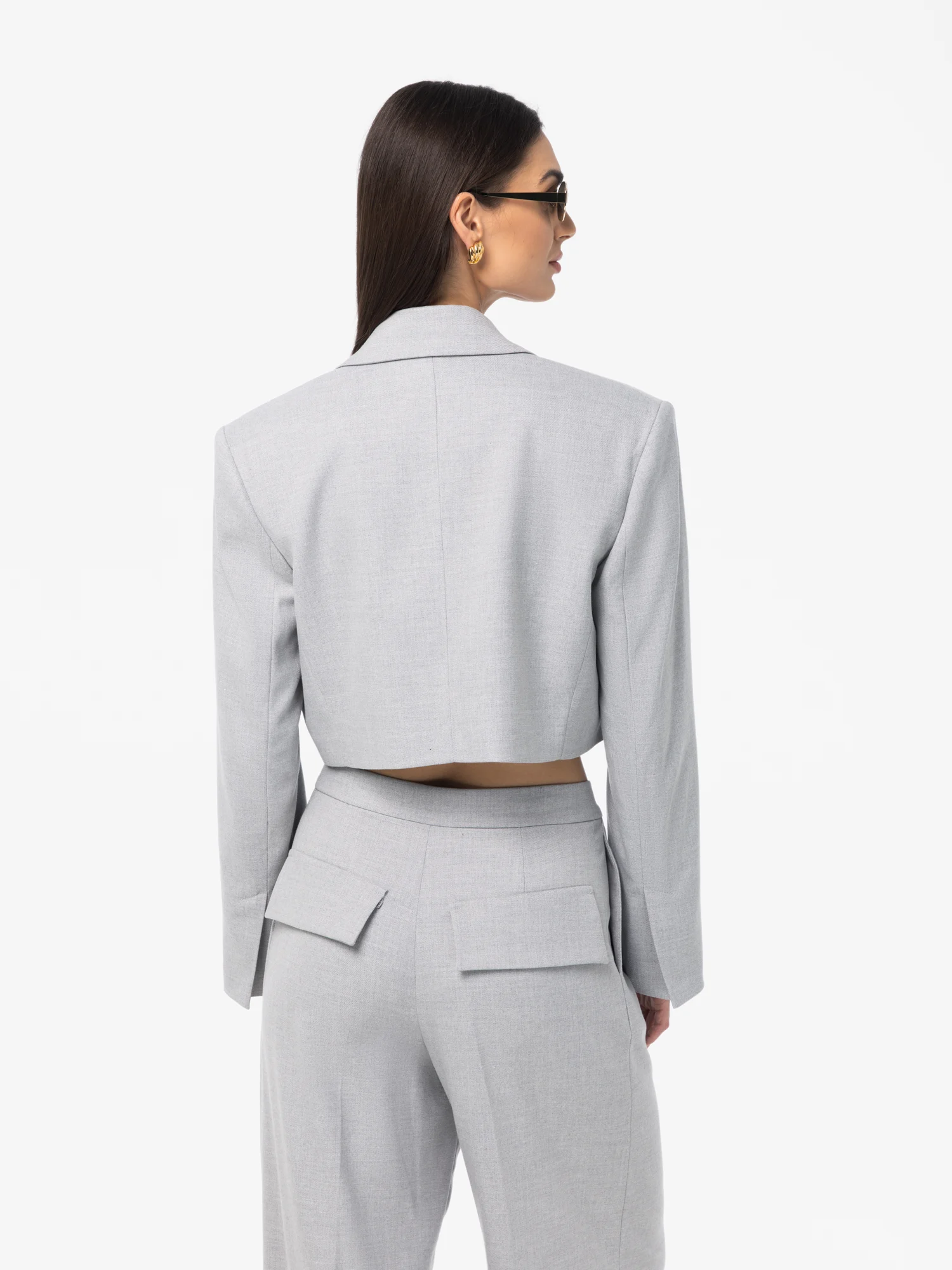 Marynarka o nowoczesnej, skróconej formie, wyróżniająca się wyraźnie zarysowaną linią ramion i geometrycznymi klapami. Dopasowany krój podkreśla talię, a minimalistyczna konstrukcja nadaje sylwetce wyrafinowany, współczesny charakter. Wykonana z eleganckiej, wiskozowej tkaniny, łączy komfort noszenia z precyzją krawiectwa. To model, który przyciąga uwagę subtelną architekturą formy i ponadczasową estetyką. Noś w komplecie ze spodniami i topem Theo.