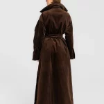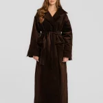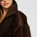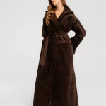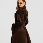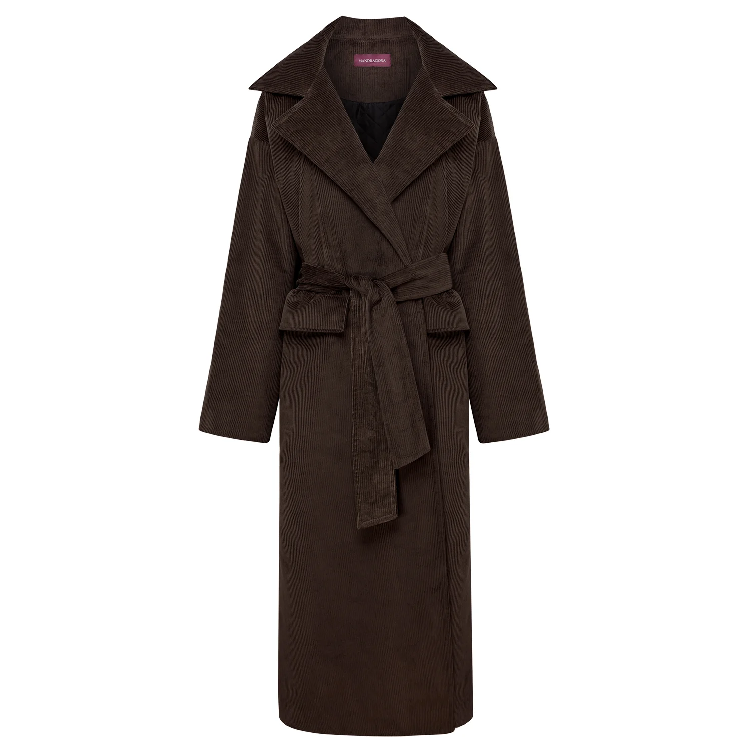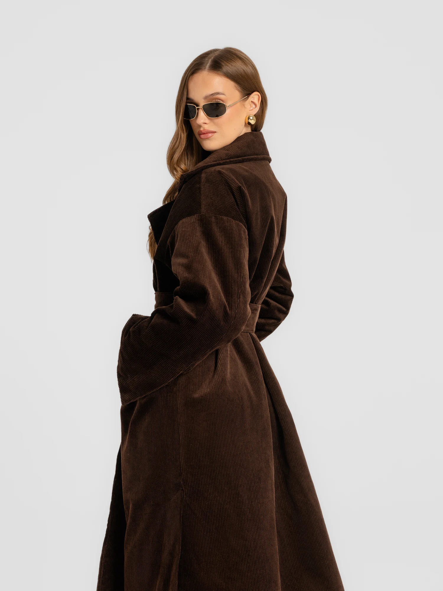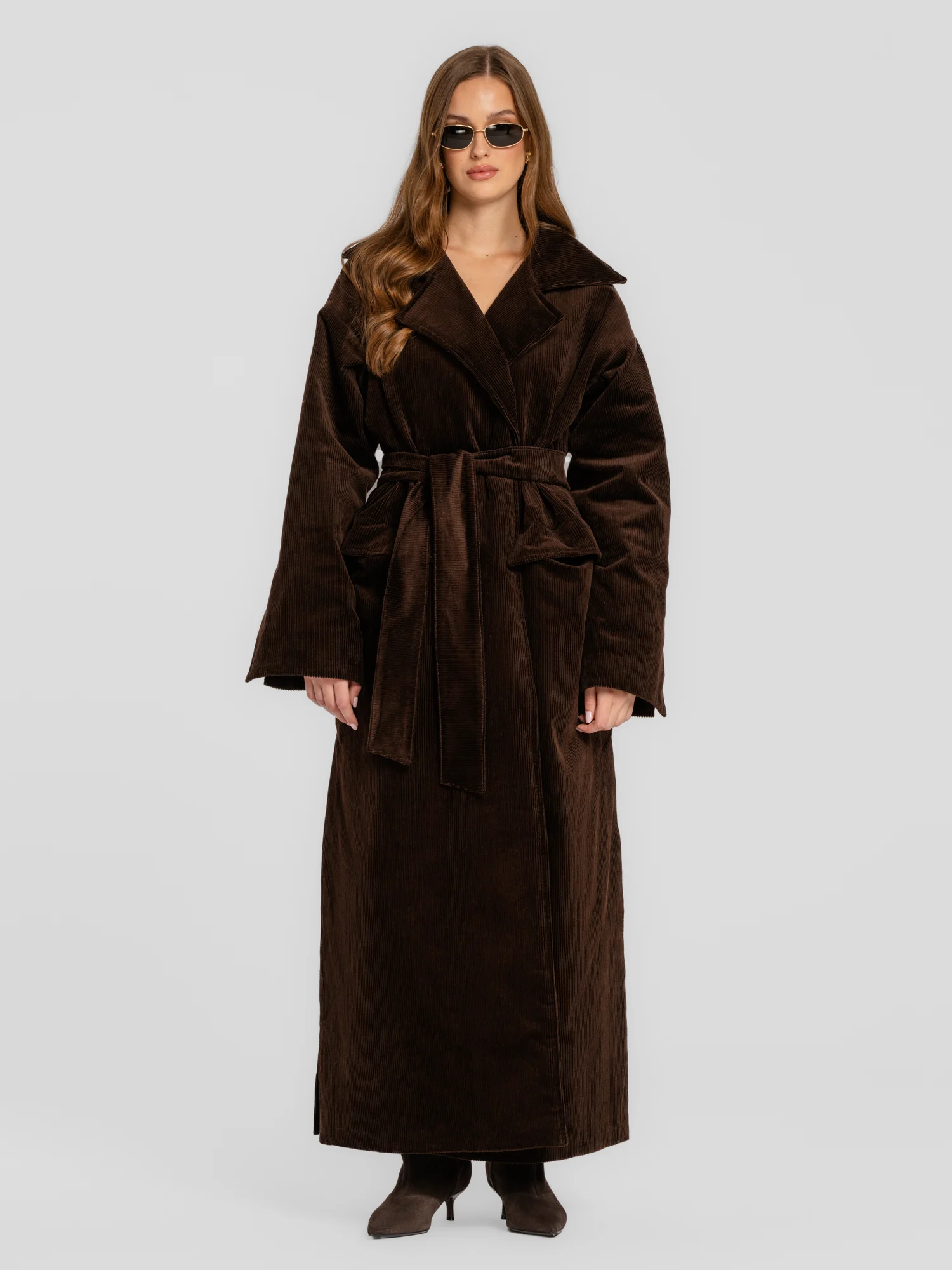 Długi płaszcz o oversize’owym fasonie, wykonany z miękkiego sztruksu o zawartości 100% bawełny. Charakteryzuje się głęboką fakturą i przyjemnym w dotyku wykończeniem. Luźna forma z szerokim kołnierzem i wiązaniem w talii podkreśla sylwetkę, zachowując jednocześnie komfort ruchu. Długość maxi dodaje wyrafinowania, czyniąc model idealnym do warstwowych stylizacji.