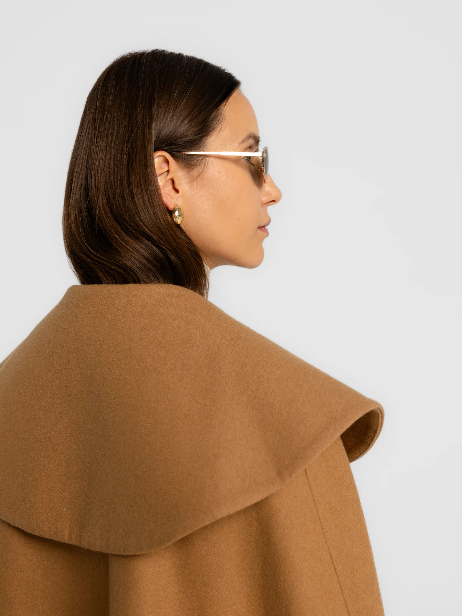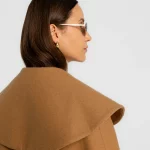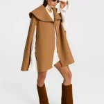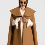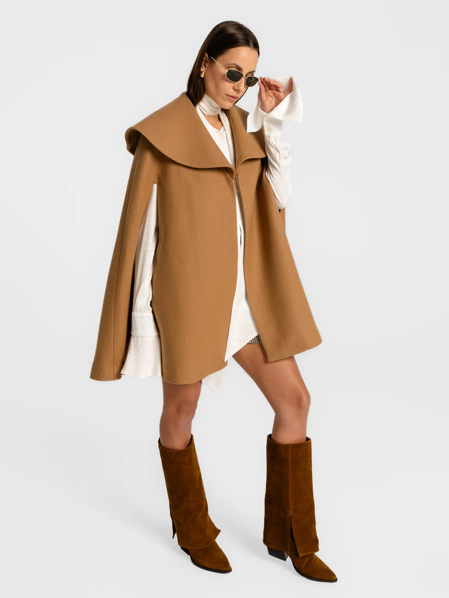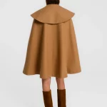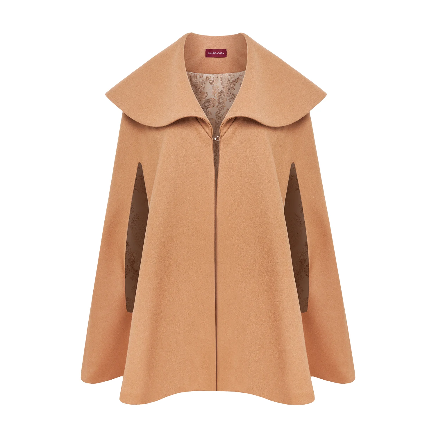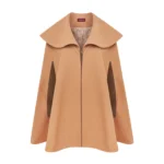Wełniane ponczo o formie peleryny, z szerokim kołnierzem i wycięciami na ręce. Elegancki i pełny swobody krój, nadający lekkości ruchom materiału. Minimalistyczna konstrukcja podkreślająca linię ramion. Zapinane z przodu na wewnętrzną haftkę. Wnętrze zdobi podszewka o szlachetnym wzorze. Idealny wybór na chłodniejsze dni, łączący klasykę z nowoczesną odsłoną szyku.