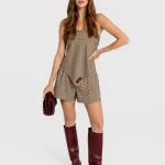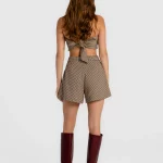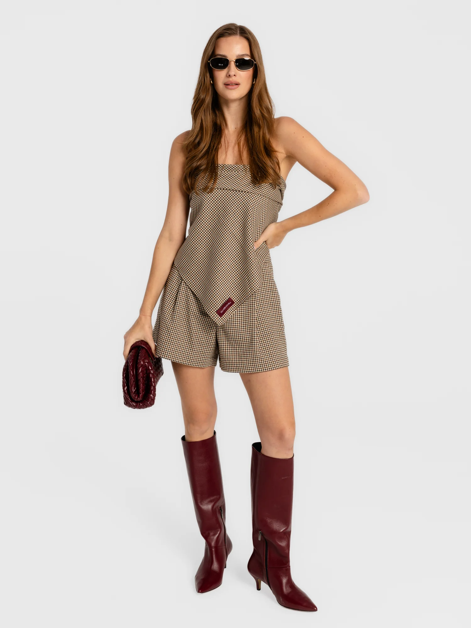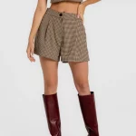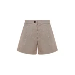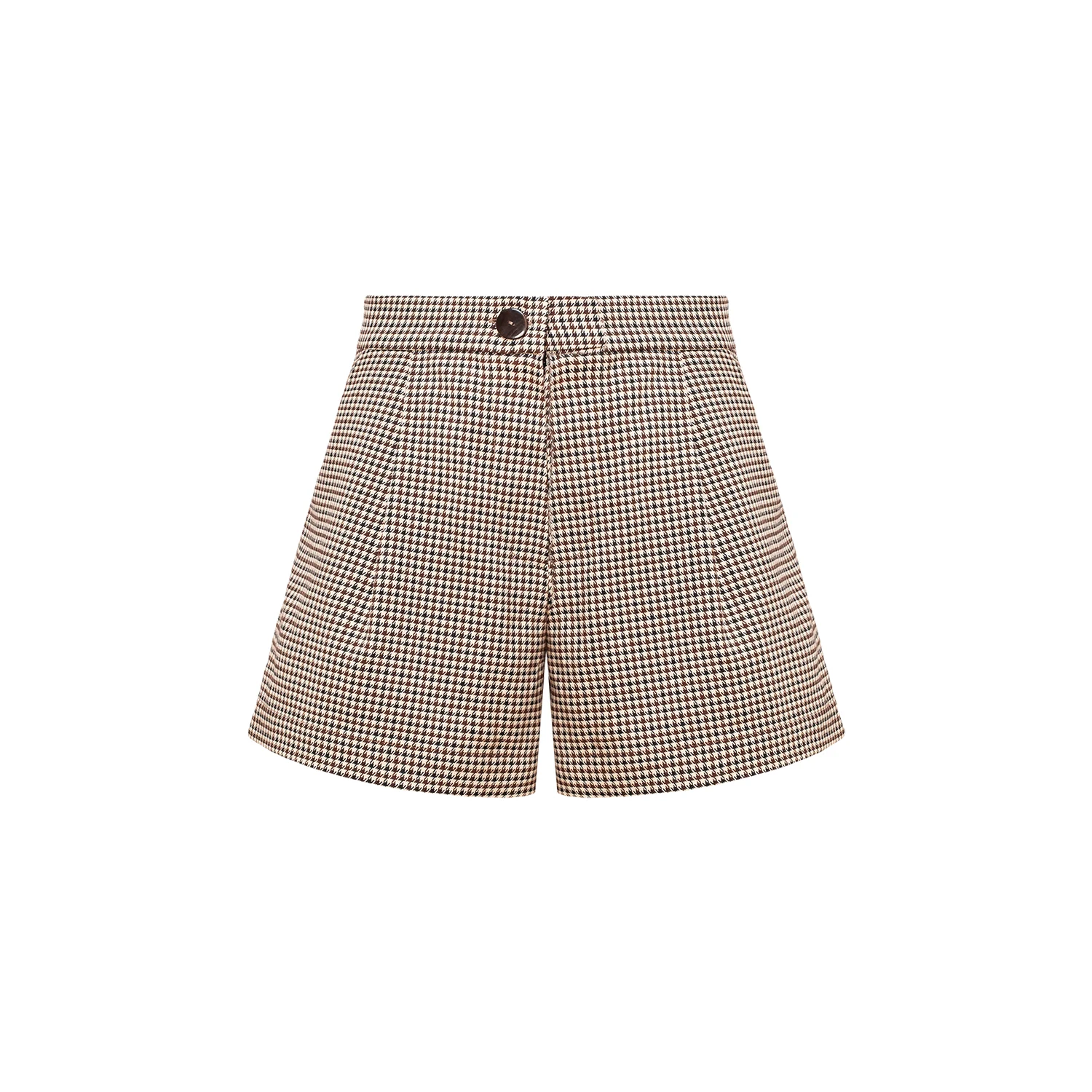 Szorty o dopracowanej konstrukcji, wykonane z tkaniny w klasyczną pepitkę. Wysoki stan i subtelne zakładki z przodu optycznie wydłużają nogi, tworząc harmonijną sylwetkę. Szerokie nogawki nadają całości swobody, a dopasowany pas podkreśla proporcje sylwetki. Całość dopełnia zapięcie na guzik i precyzyjne przeszycia.