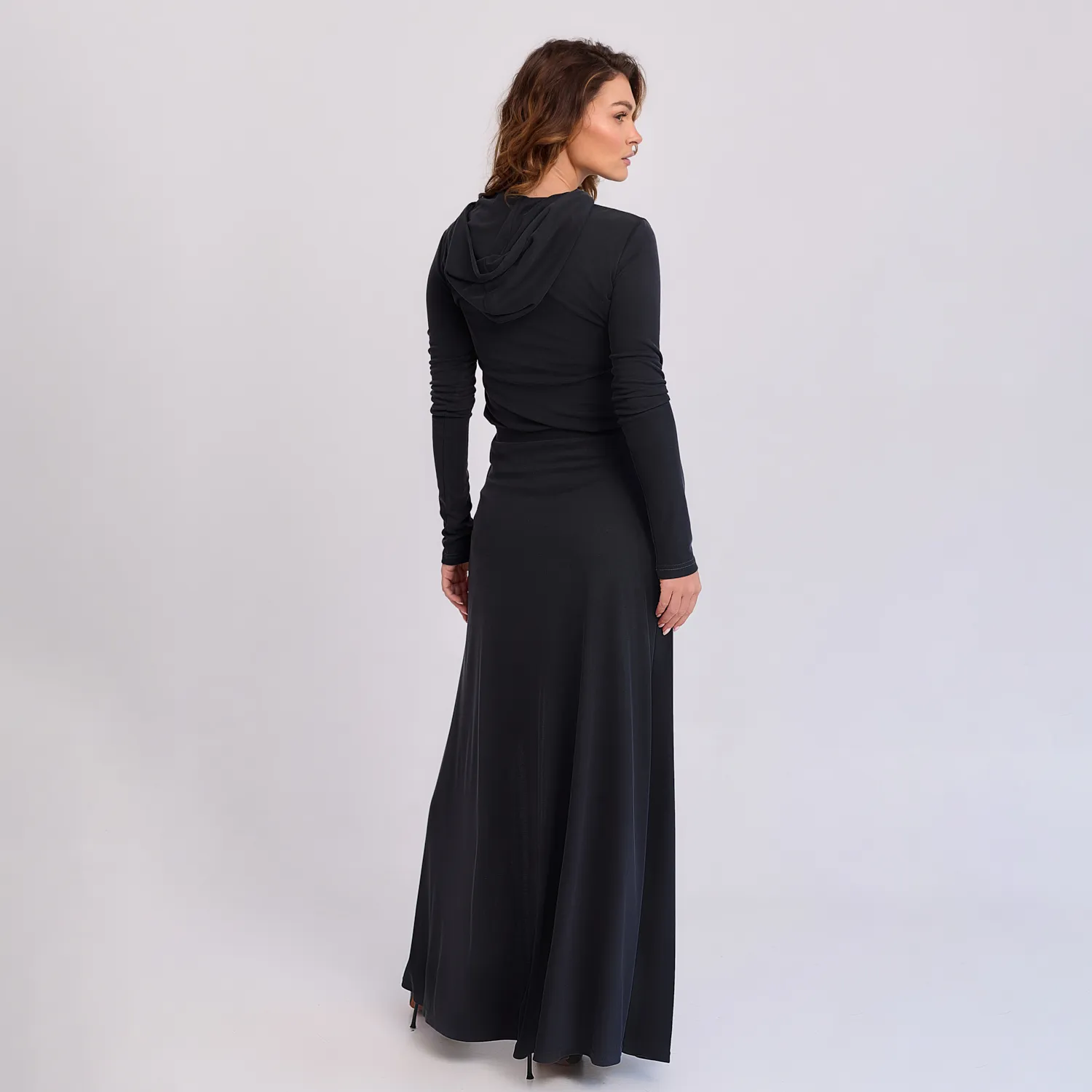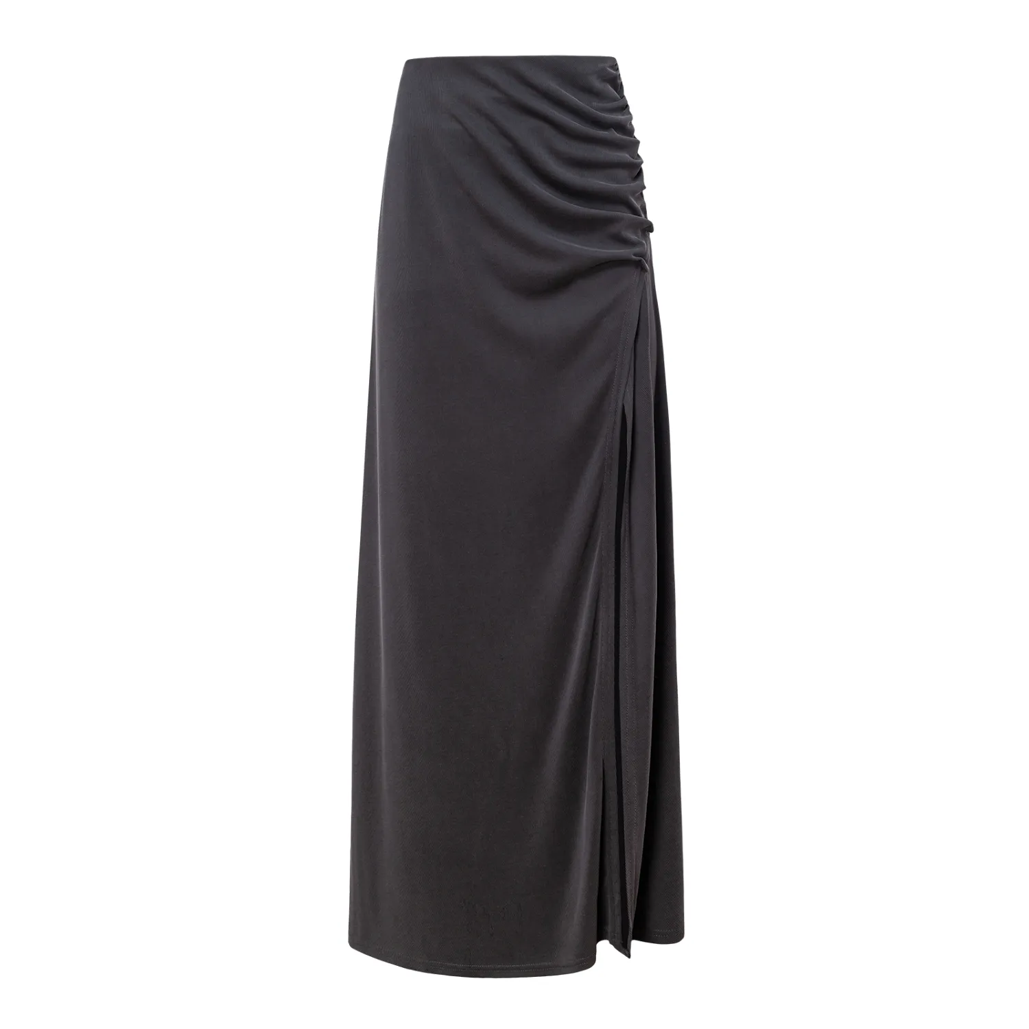 Drapowanie na wysokości bioder harmonijnie modeluje sylwetkę, a wysokie rozcięcie optycznie ją wysmukla.