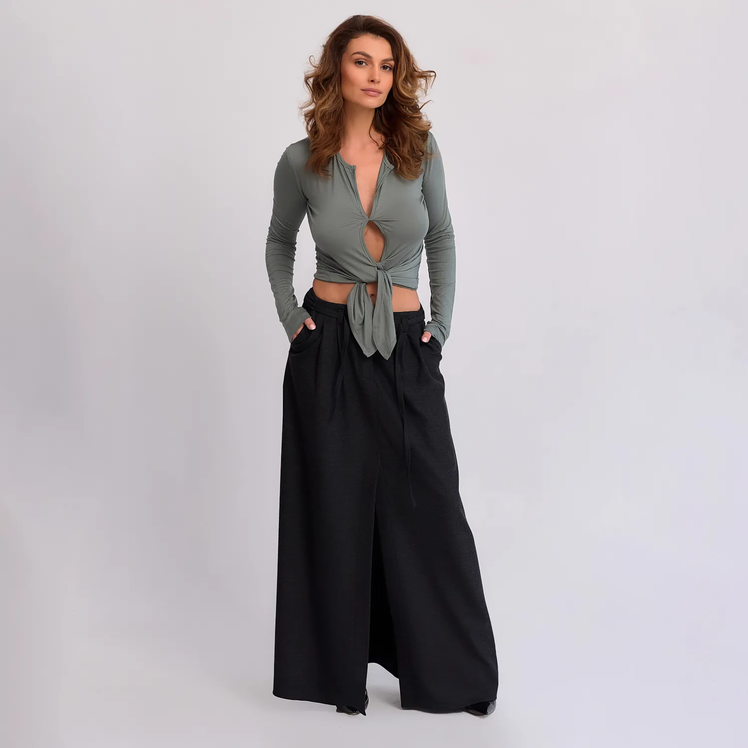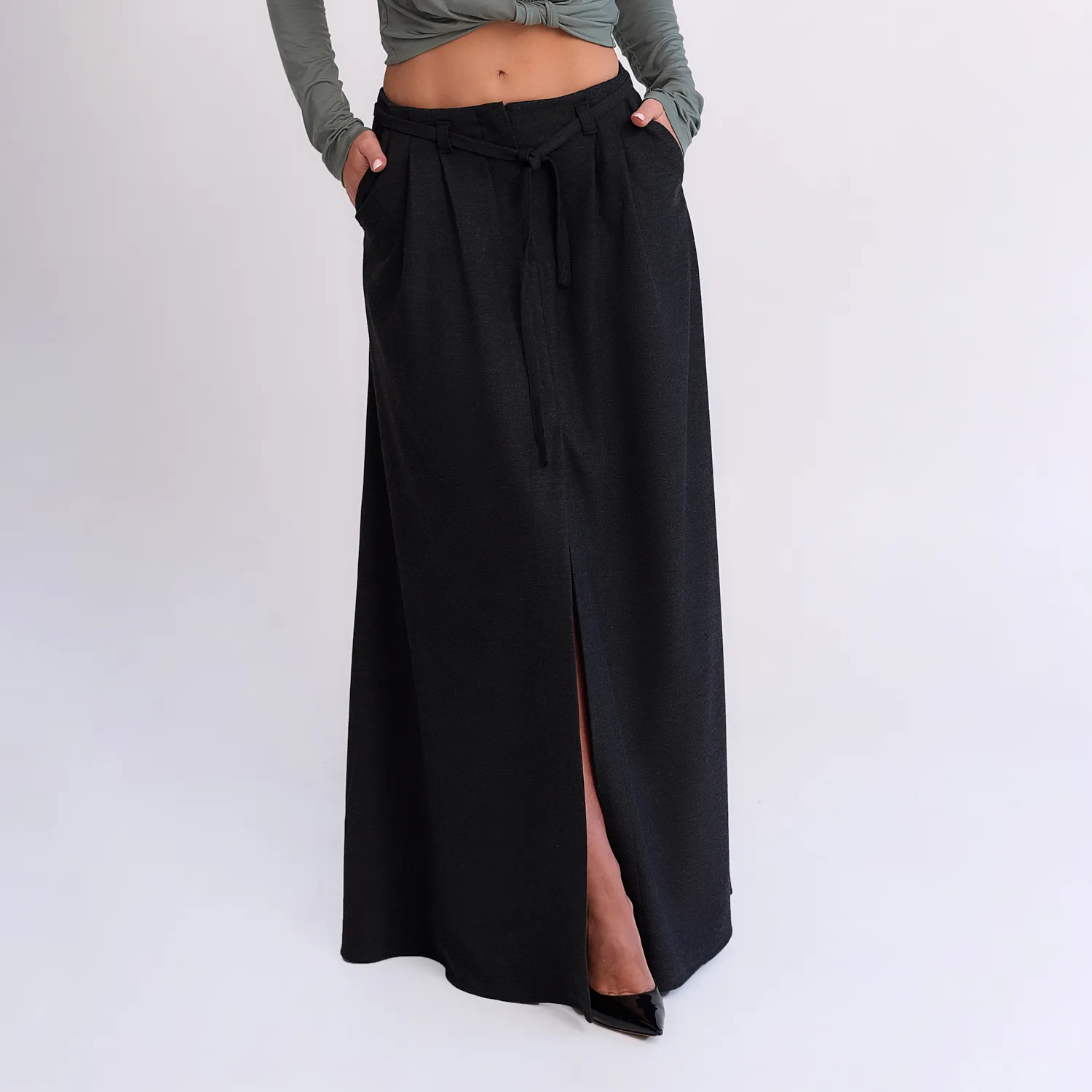 Estetycznie wykończone, wysokie rozcięcie z przodu, przełamuje prostą formę spódnicy. Zakładki przy talii, dodatkowo modelują jej kształt. Zapinana na suwak. Całość dopełnia wykonany z tego samego materiału sznureczek, który można nosić jako pasek lub stosować jako subtelny akcent dekoracyjny.