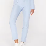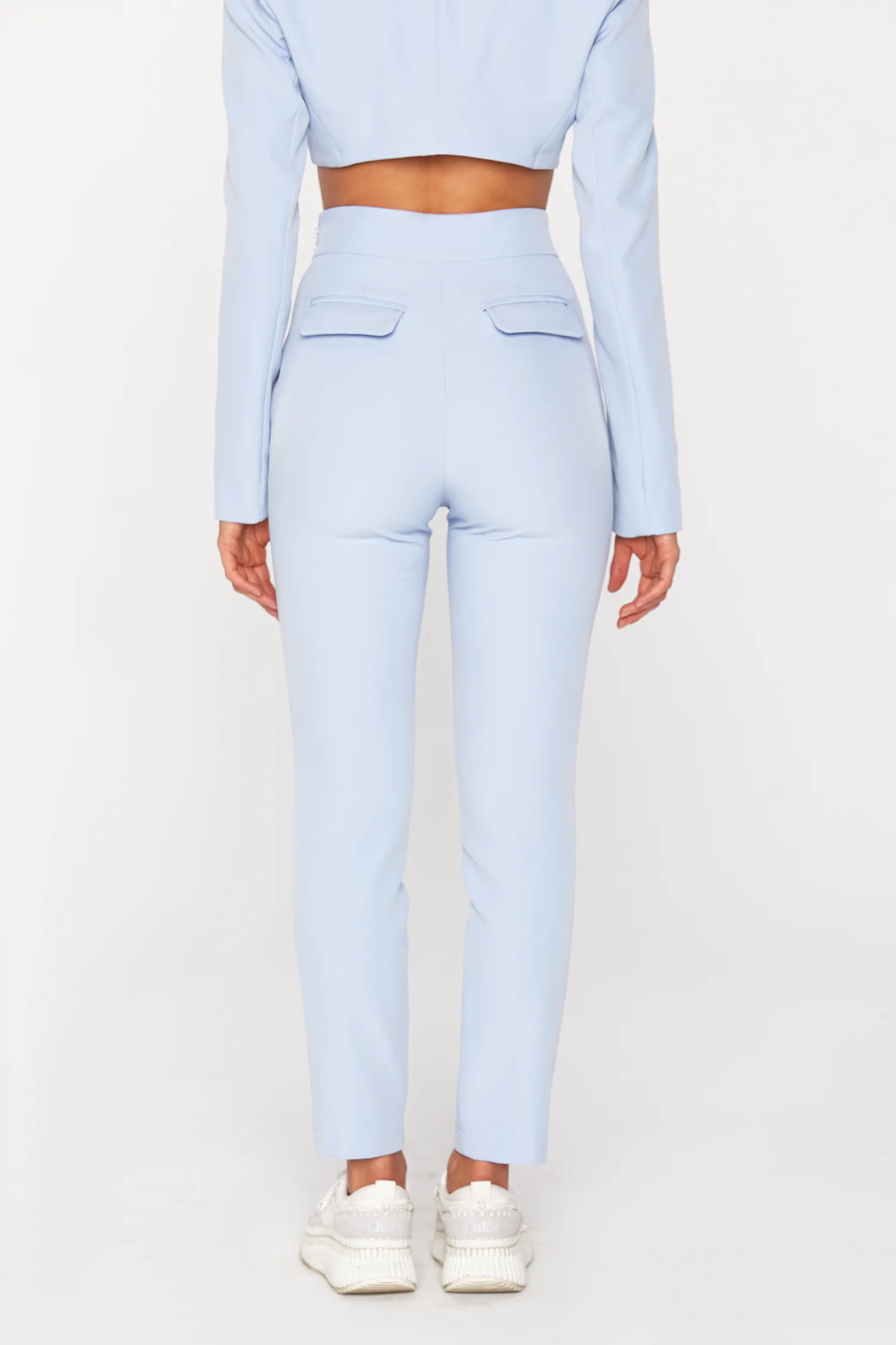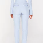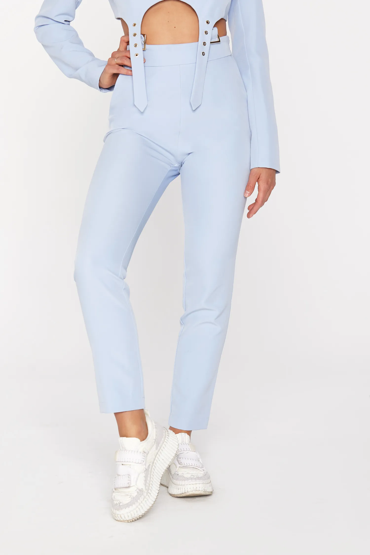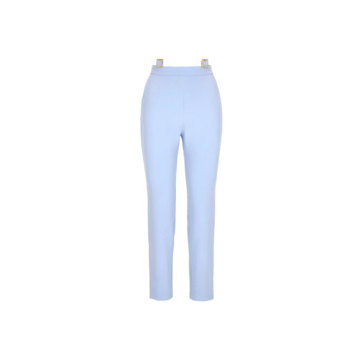 Spodnie garniturowe z wysokim stanem i złotymi klamrami. Zjawiskowy, błękitny kolor to idealny wybór dla eleganckich stylizacji w okresie wiosna-lato. Znacząca ilość poliestru w składzie sprawia, że tkanina utrzymuje właściwą formę, nie wyciąga się oraz jest odporna na zagniecenia. Spodnie posiadają zapięcie z boku. Dwie boczne kieszenie oraz imitacje z klapami z tyłu.