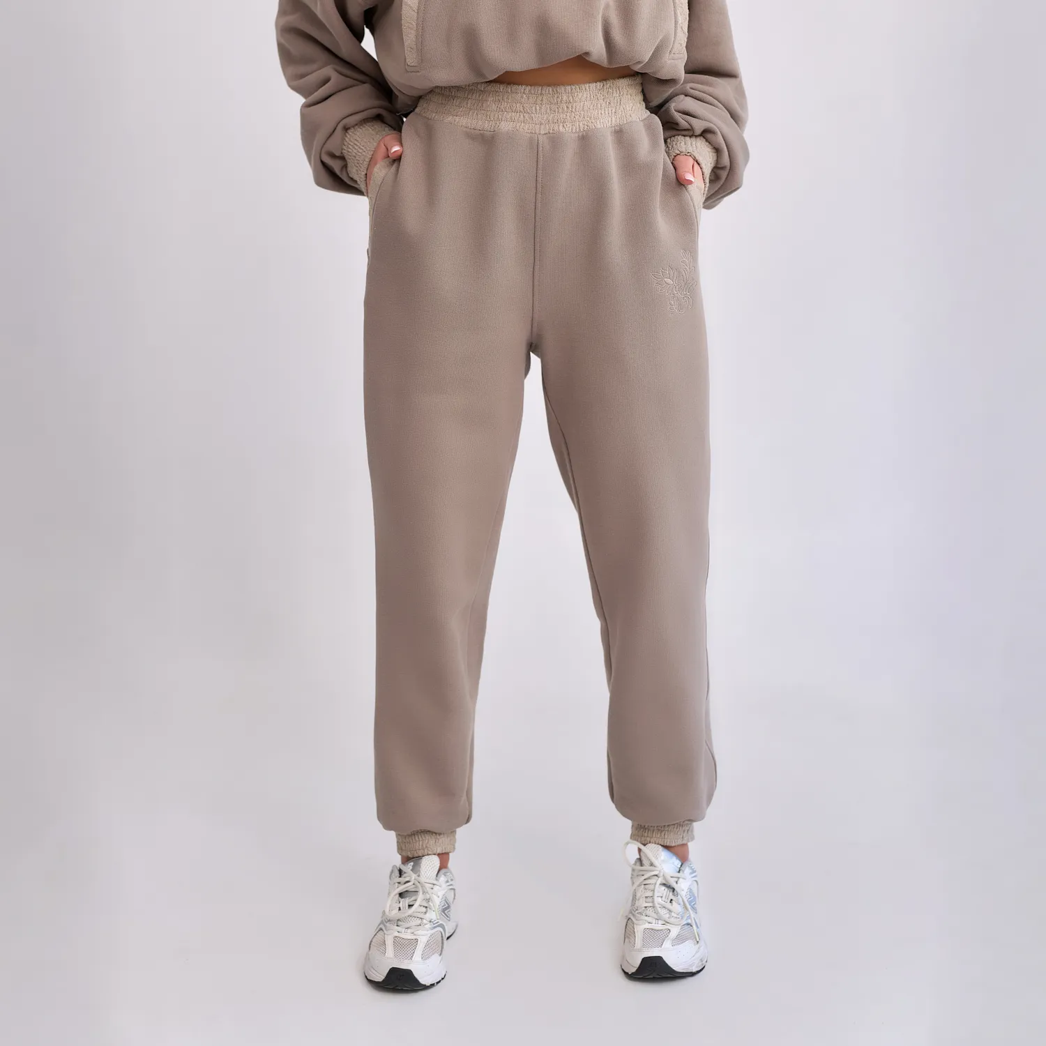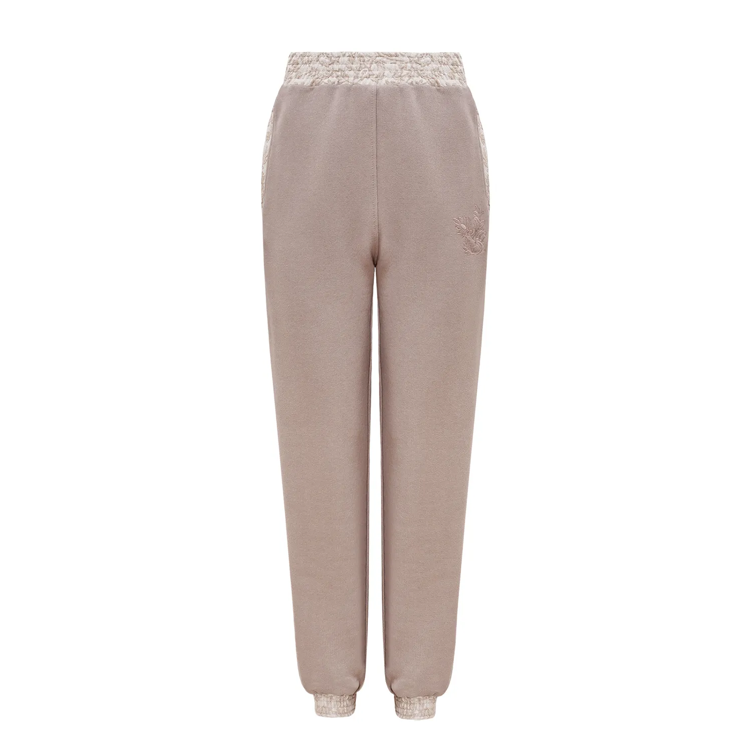 Subtelny, ale znaczący detal w postaci żakardowych obszyć, który pojawia się na ściągaczach oraz wykończeniach, nadaje spodniom unikalnego charakteru. Delikatny, kwiatowy wzór wpleciony w tkaninę dodaje wyrafinowania, tworząc spójny zestaw z bluzą Lantre. Dwie boczne kieszenie, a przy jednej z nich – drobny haft logo.