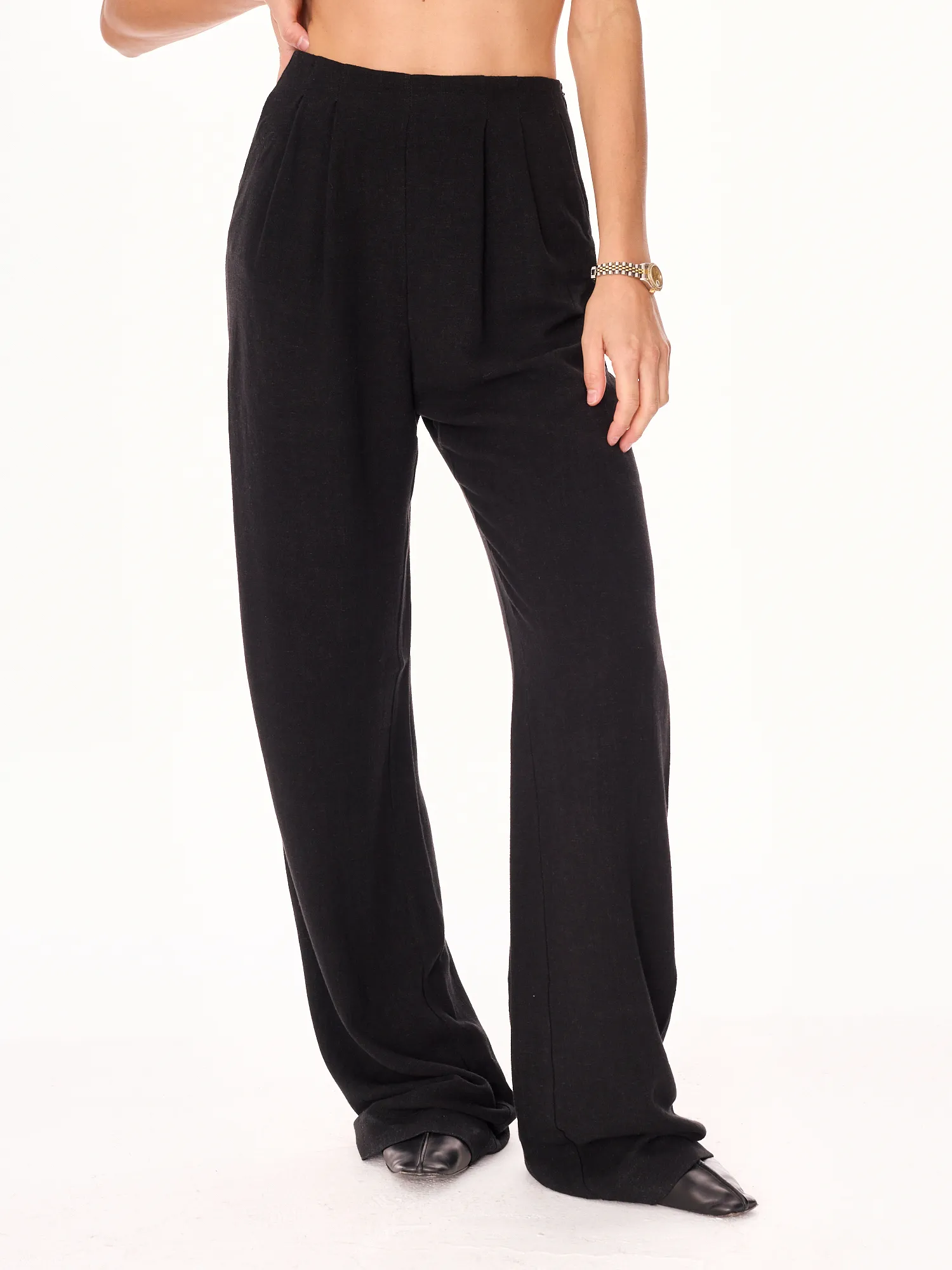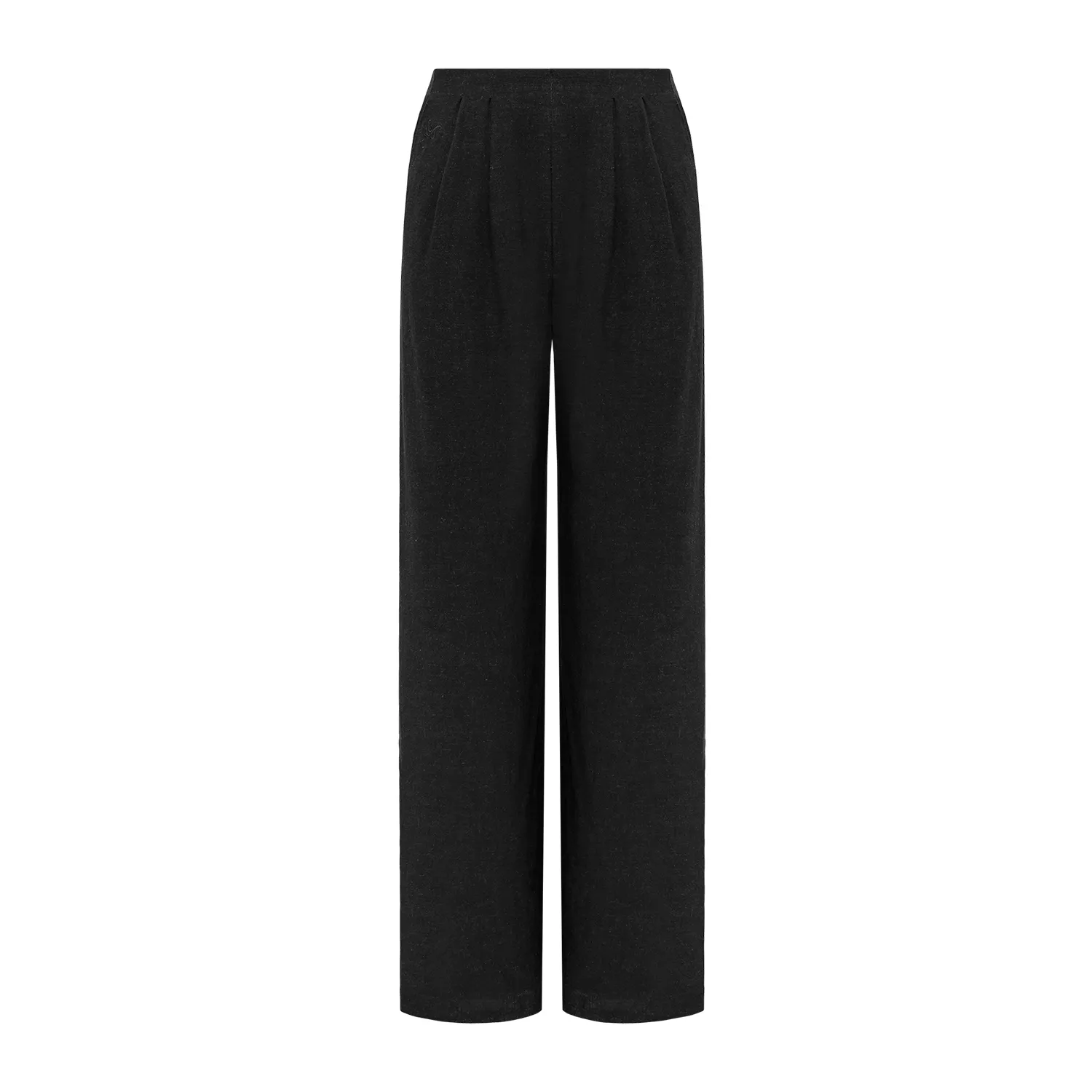 Spodnie o wysokim stanie, z lejącymi, szerokimi nogawkami. Wykonane z materiału z domieszką lnu, który jest przyjemny w dotyku, pięknie się układa i komfortowo nosi. Modne zakładki na przodzie, które dodają struktury. Dwie kieszenie boczne, które zdobi delikatny haft „MG”. Zapinane na ukryty zamek z boku, dzięki czemu spodnie zachowują prosty, elegancki wygląd.