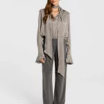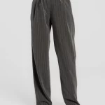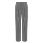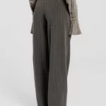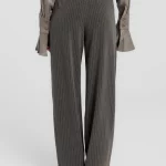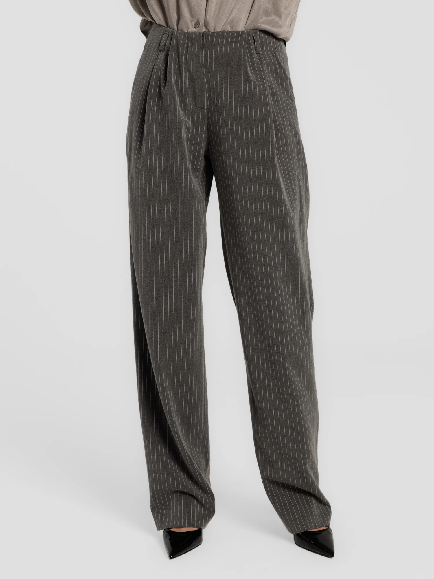 Spodnie o prostej, lekko luźnej linii nogawki, wykonane z przyjemnej dla ciała tkaniny. Średni stan i dopracowany krój podkreślają sylwetkę, zapewniając jednocześnie wygodę noszenia. Subtelne zakładki przy pasie nadają formie lekkości. W zestawie sznureczki wykonane z tej samej tkaniny, które pozwalają na przełamanie prostej nogawki spodni.
