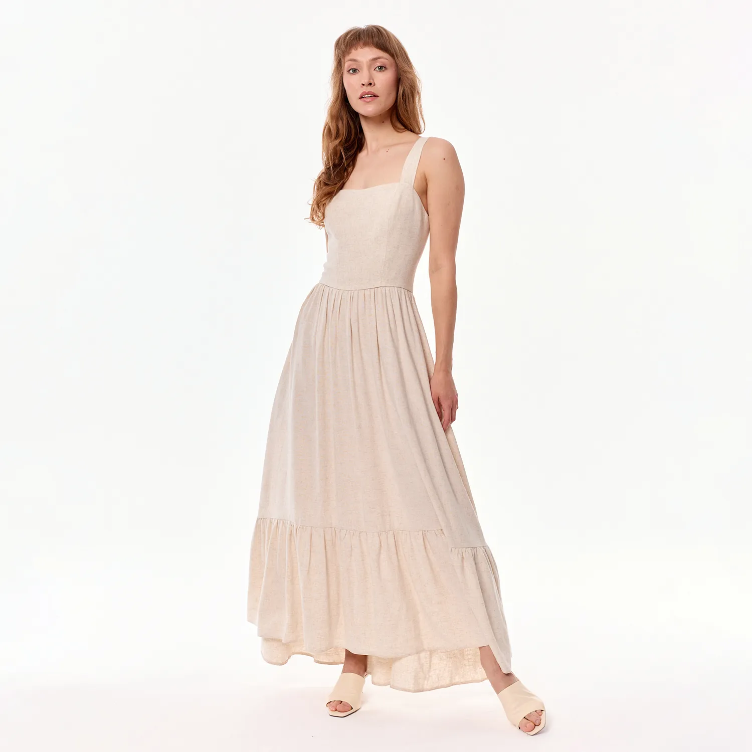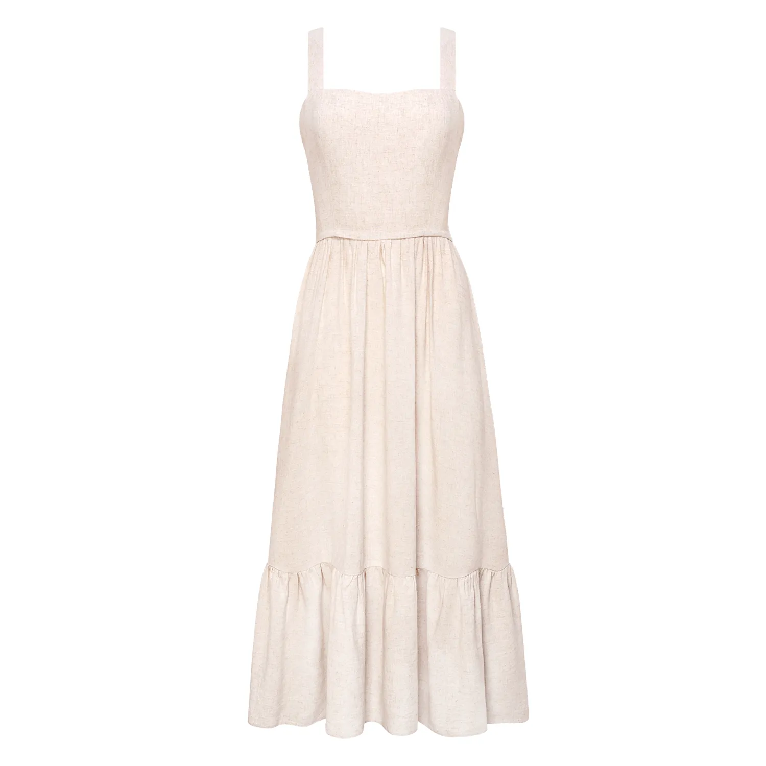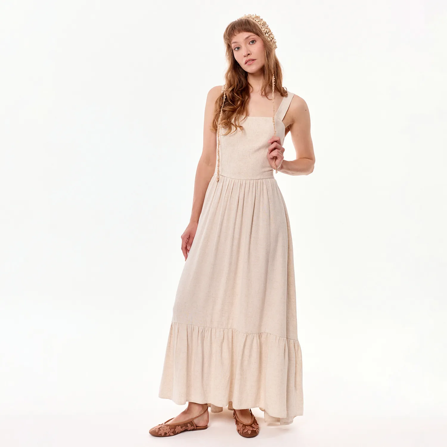 Sukienka Meg to połączenie delikatności, kobiecości i wyrafinowanej prostoty. Uszyta z miękkiej mieszanki wiskozy i lnu, swobodnie układa się na sylwetce, pozwalając skórze oddychać w cieplejsze dni.