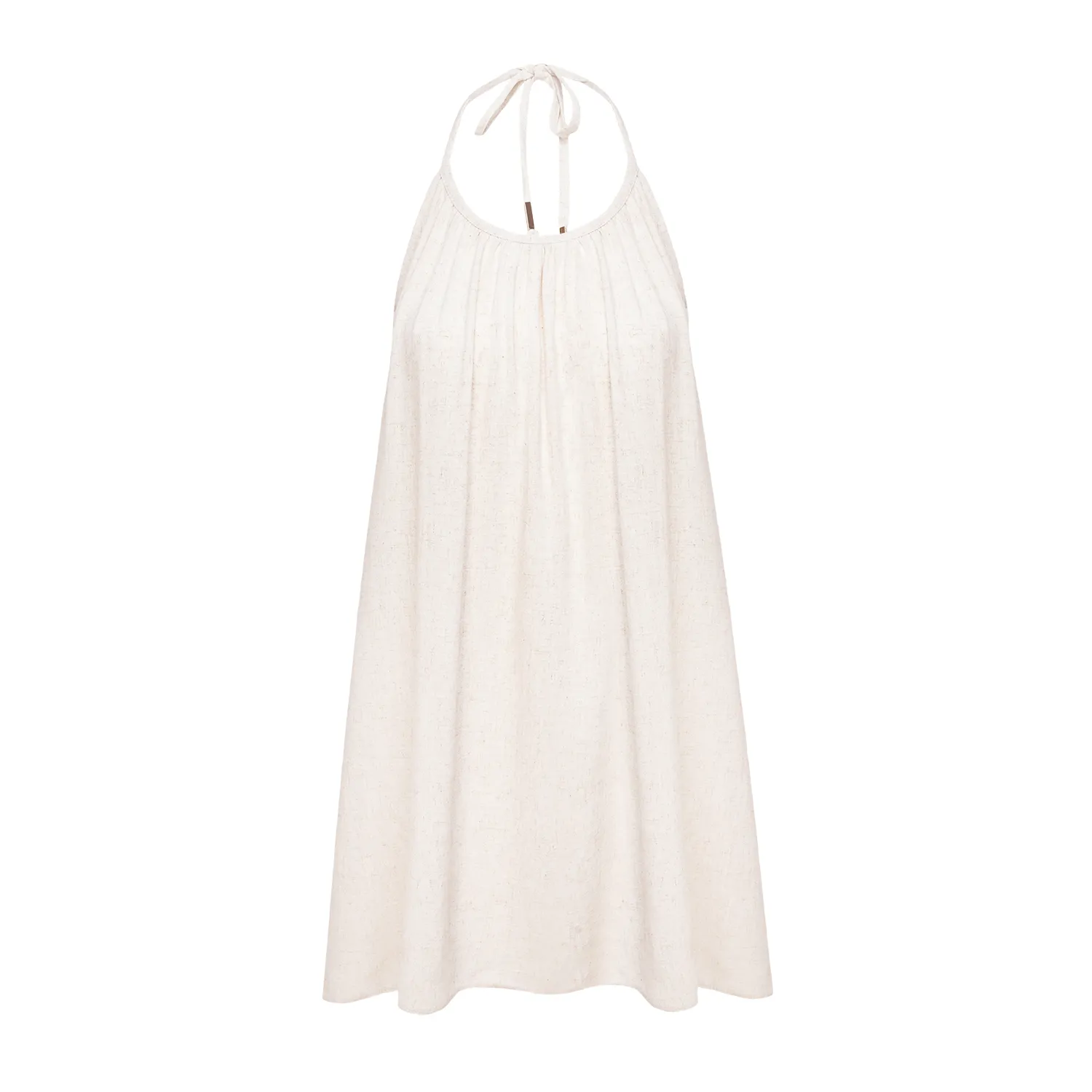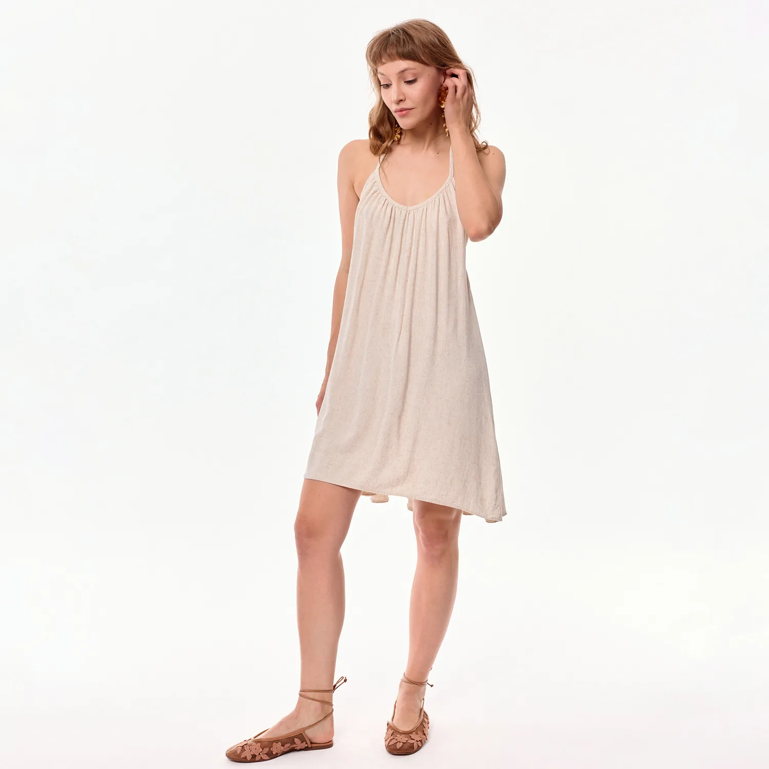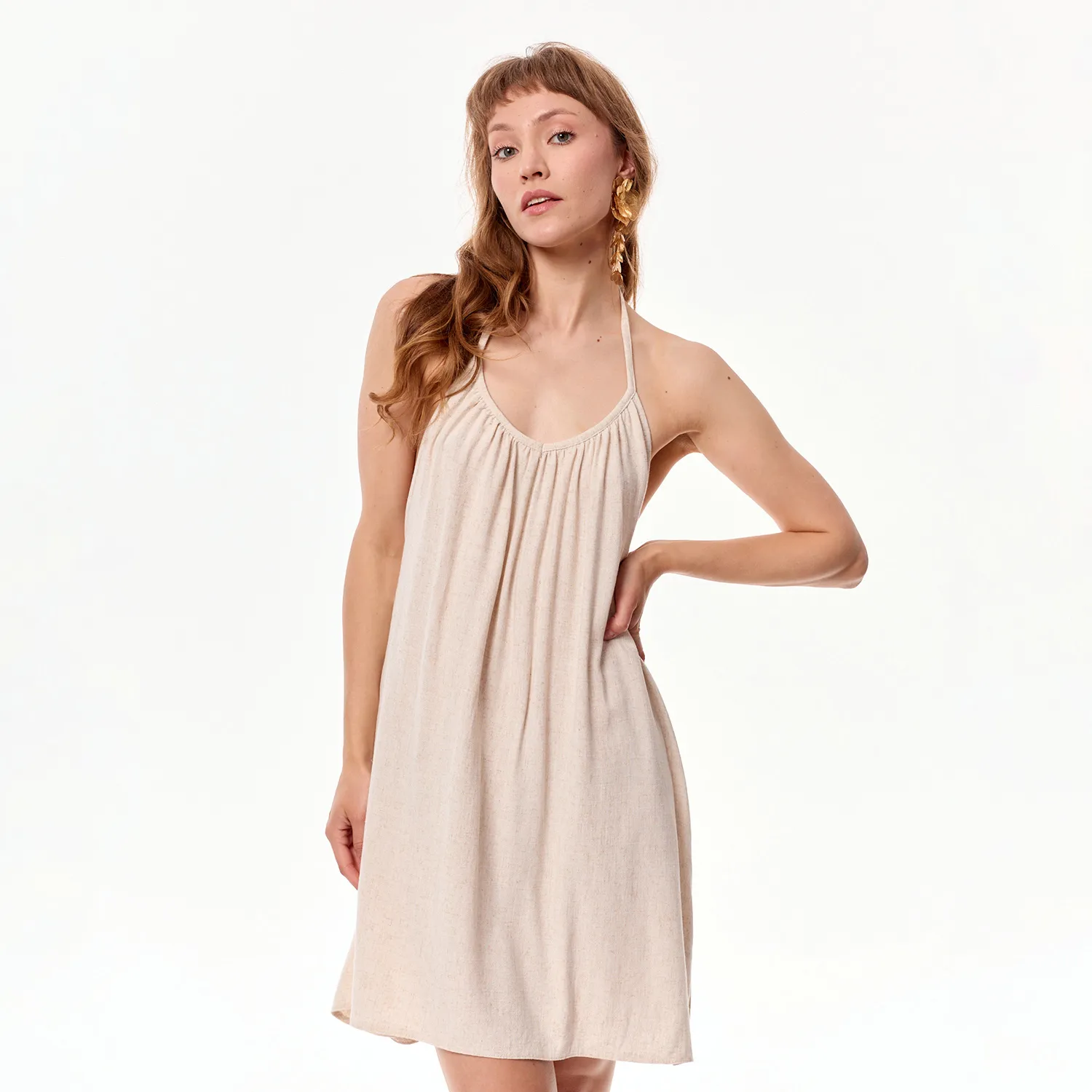 Sola to kwintesencja lekkości i zmysłowości w minimalistycznym wydaniu. Uszyta z przyjemnej w dotyku mieszanki wiskozy i lnu, subtelnie otula sylwetkę, pozostawiając pełną swobodę ruchu. Jej prosty krój z delikatnym marszczeniem pod dekoltem harmonijnie kontrastuje z mocno wyeksponowanymi plecami.