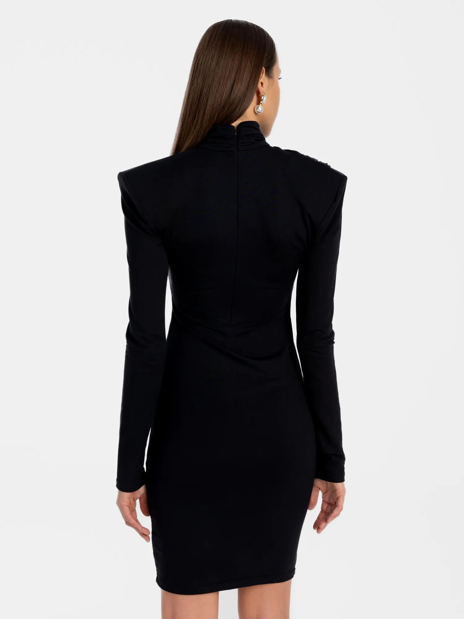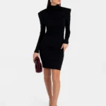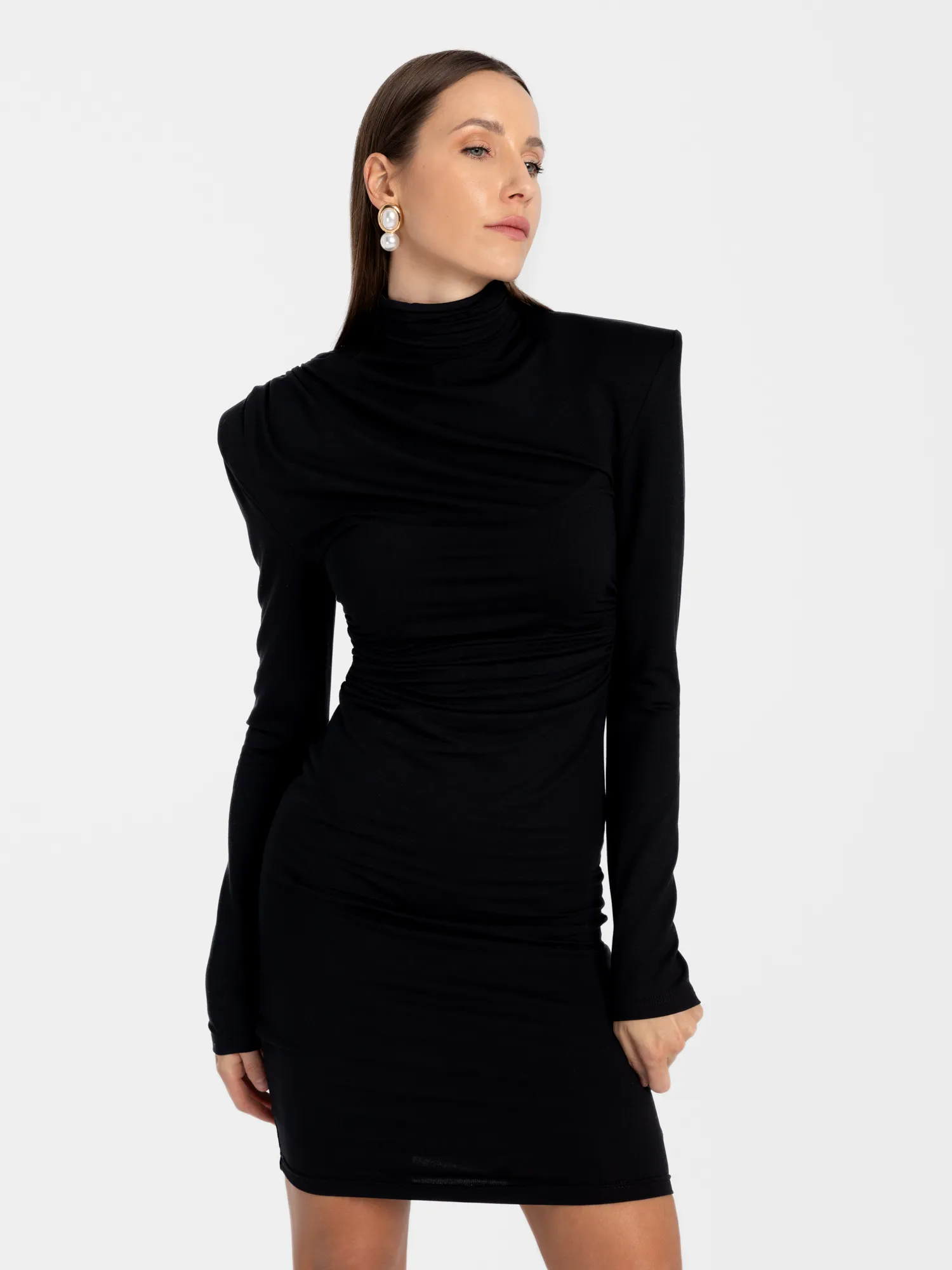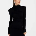 Sukienka o dopasowanym kroju, z subtelnym golfem. Charakterystyczne marszczenia modelują sylwetkę. Długość sięgająca kolan nadaje jej elegancji, a elastyczna tkanina z modalu zapewnia wygodę i idealne dopasowanie do ciała. Prosta forma przełamana delikatnym drapowaniem tworzy efekt wysmuklający, zachowując przy tym minimalistyczny charakter. To klasyczny, a zarazem zmysłowy model, który doskonale sprawdzi się zarówno na co dzień, jak i na wieczór.