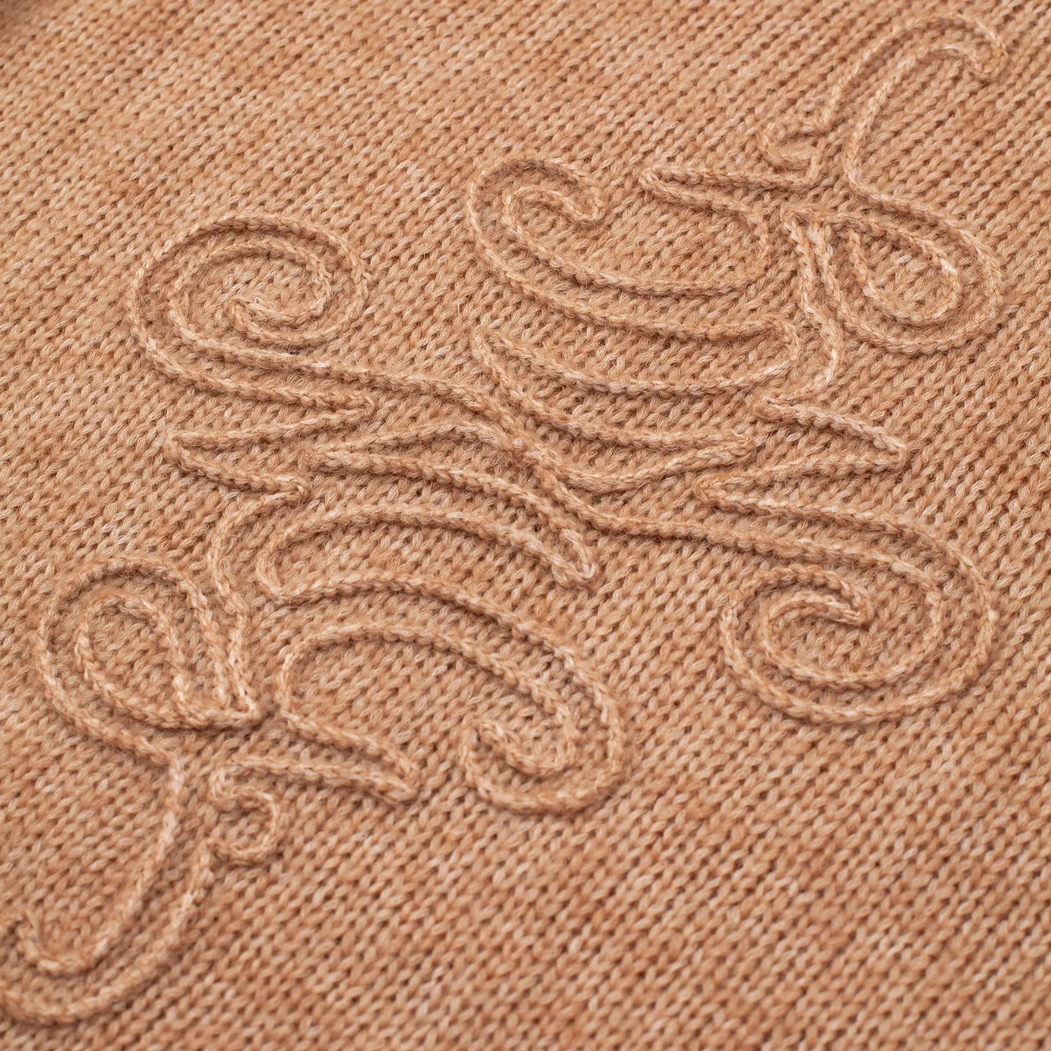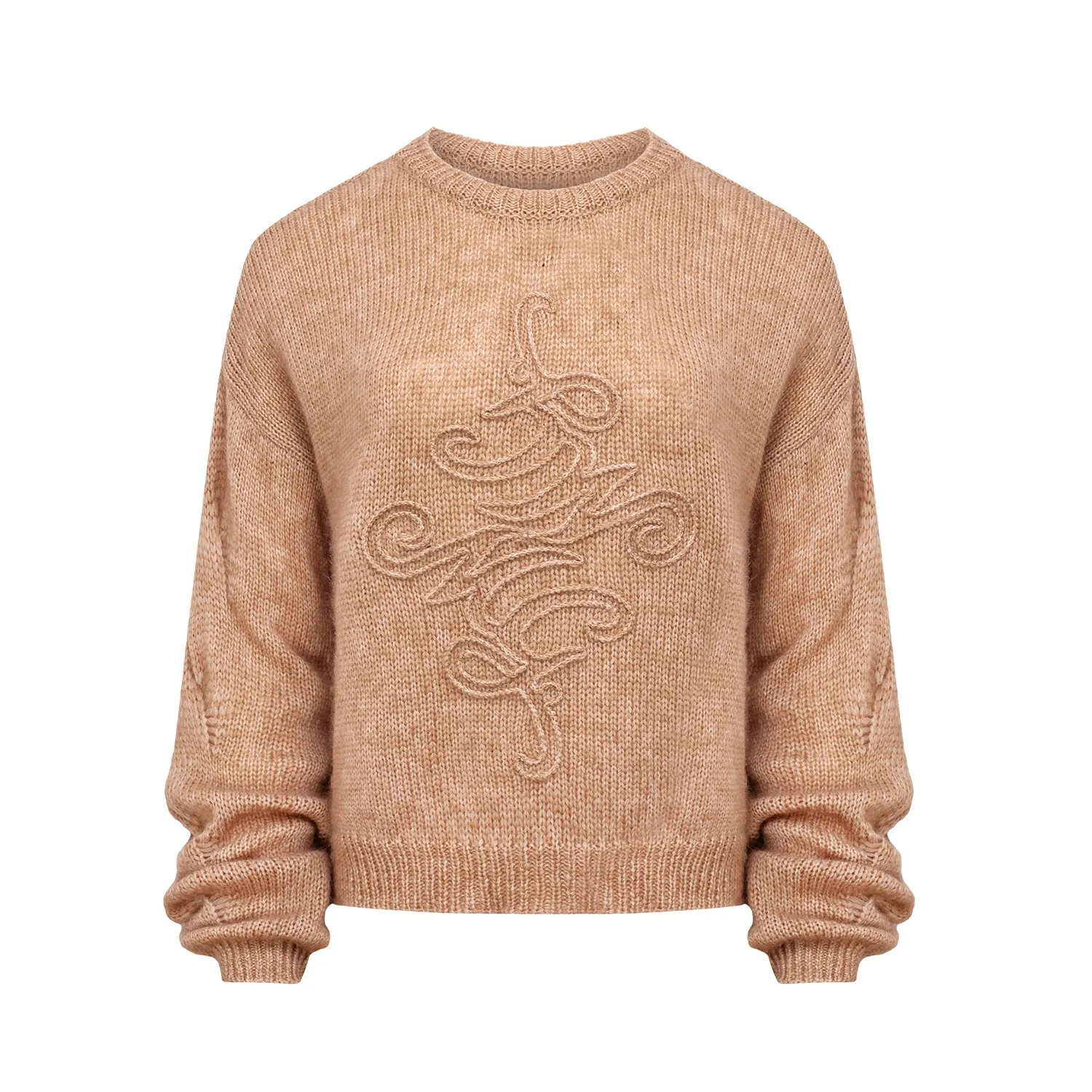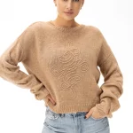 Charakterystycznym elementem sweterka jest spore logowanie, które wykonane w kolorze przędzy, nadaje mu oryginalnego, lecz nie przesadzonego uroku.