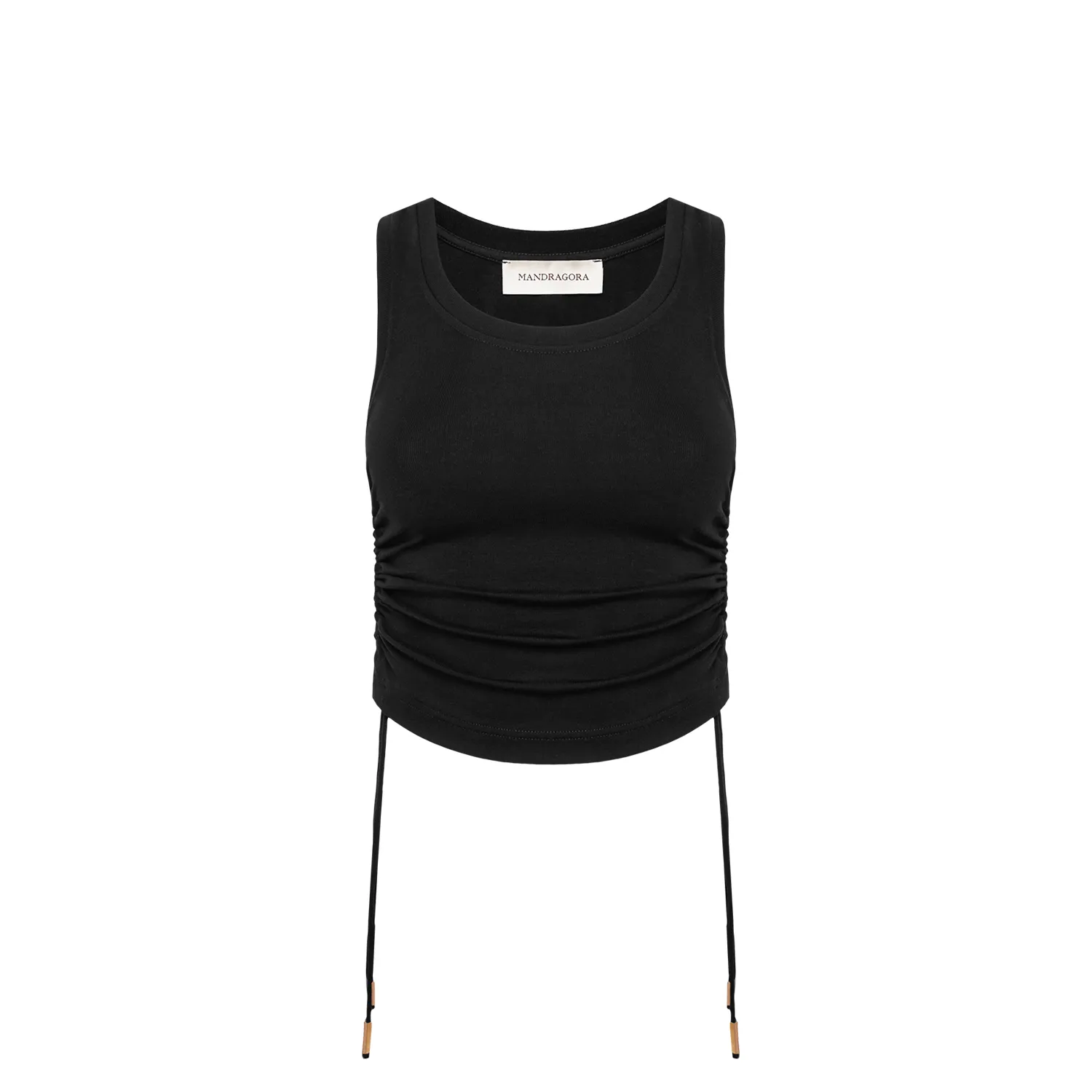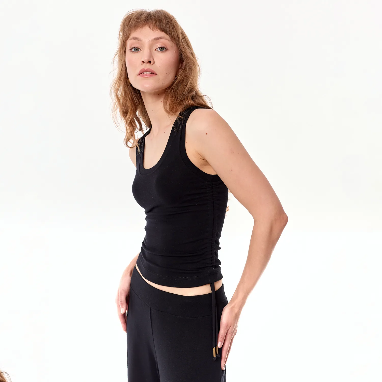 Boczne ściągacze pozwalają regulować długość topu i dopasować jego charakter do stylizacji. Ozdobne sznurki, zakończone złotymi przelotkami z grawerem, dodają całości subtelnego luksusu. Prosty, ale efektowny krój na ramiączkach podkreśla ramiona oraz dekolt.